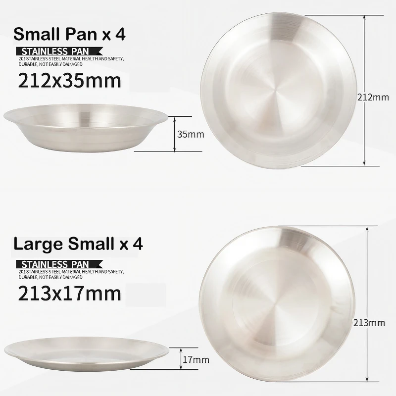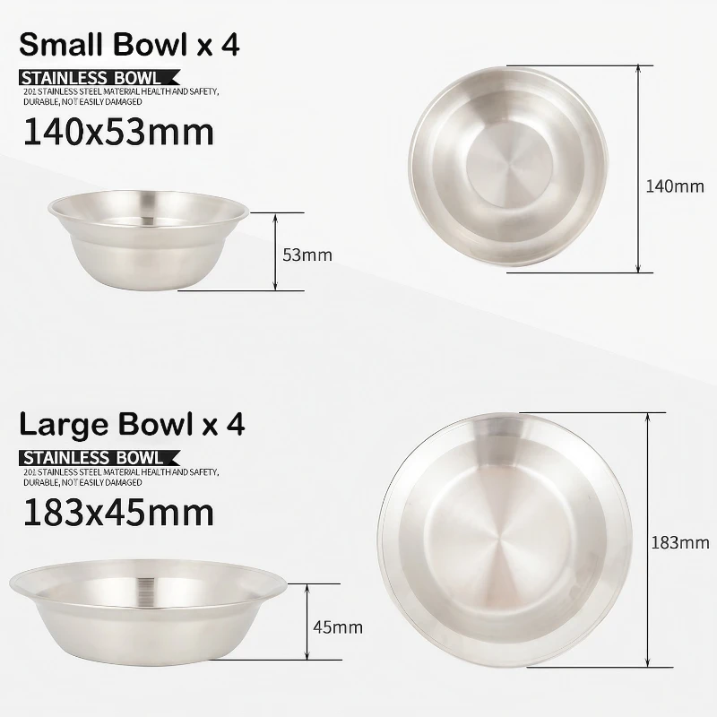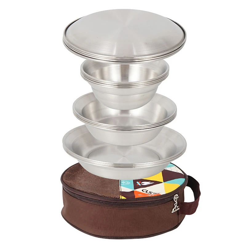 Prepare for any adventure with our 16-Piece Stainless Steel Outdoor Dining Set. Crafted from high-quality 201 stainless steel, this set promises health and safety without sacrificing durability. The complete set includes 4 deep plates, 4 shallow plates, 4 bowls , and 4 smaller bowls , all designed to resist damage and wear. The entire kit nests conveniently into a custom-designed storage bag, making it perfect for camping, picnics, and outdoor excursions. The bag’s dimensions are 23 x 23 x 8 cm, and the set’s total weight is 2360g, offering a balance between portability and robust construction.