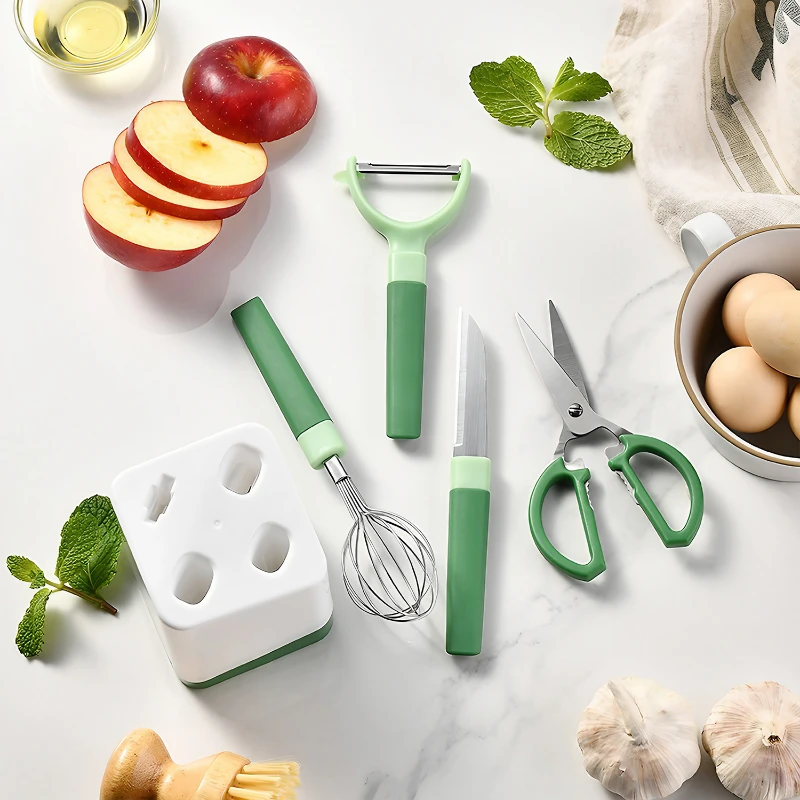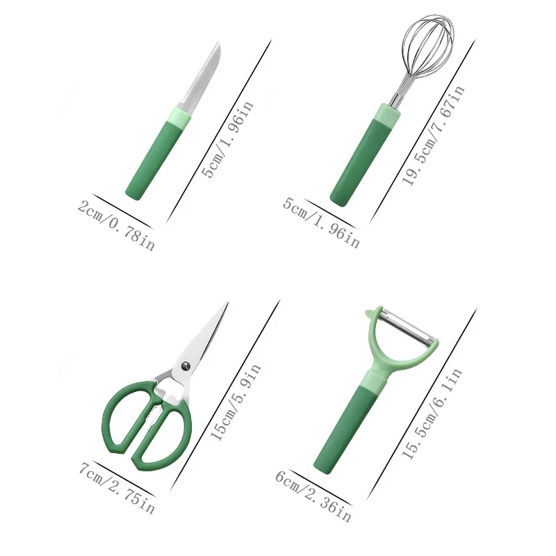 The 5-Piece Kitchen Tools Set is an indispensable collection for any culinary space, offering a range of cooking and preparation solutions. This set is comprised of a durable paring knife, versatile kitchen scissors, a practical bottle opener, a sturdy grater, and an efficient whisk. Each tool is crafted from stainless steel for longevity and features a comfortable polypropylene handle in a vibrant green color, adding a pop of freshness to your kitchen. The sleek white storage stand, measuring 4.13 inches tall, provides a stylish and convenient way to keep these essentials at hand on your countertop. Ideal for daily use, this set simplifies a variety of kitchen tasks from chopping and slicing to whisking and grating, catering to both novice cooks and seasoned chefs.