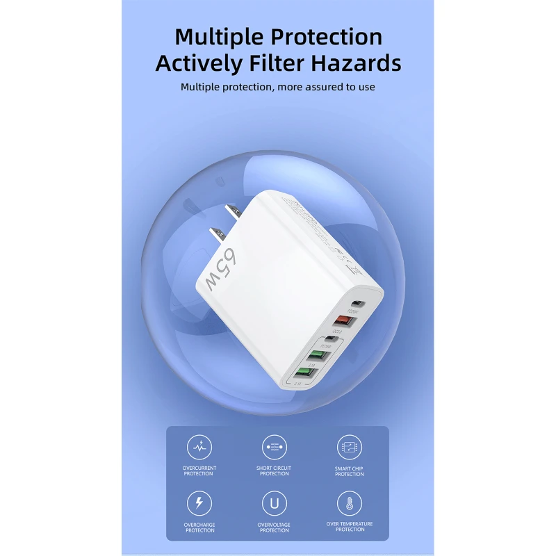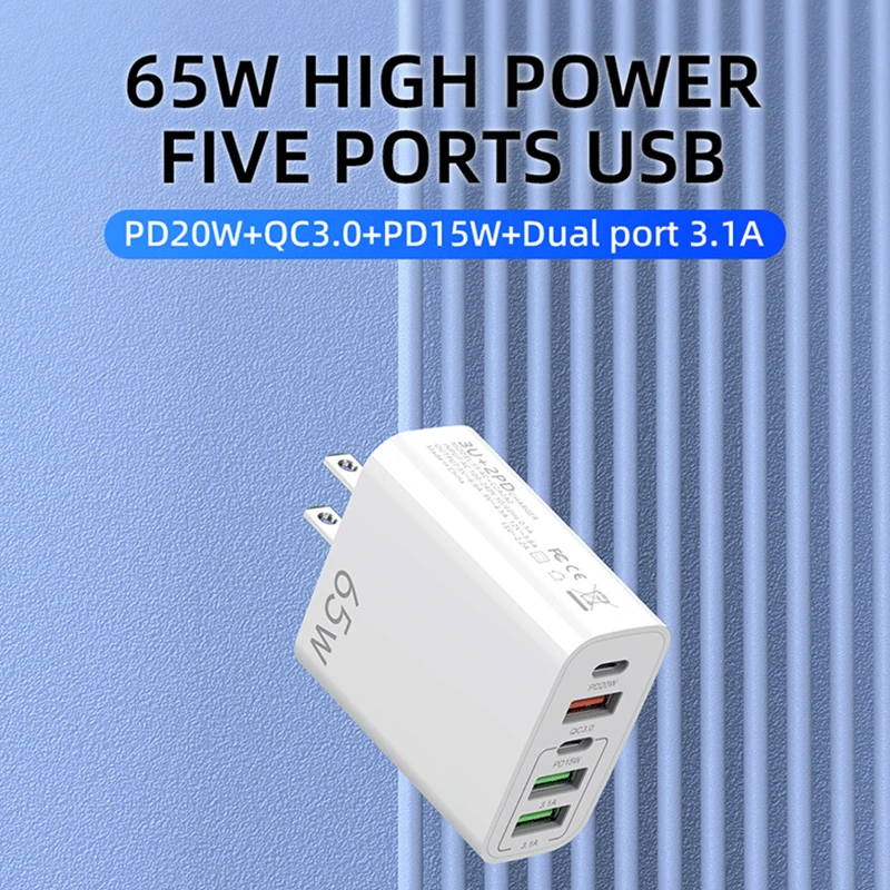 The 65W Multi-Port Fast Charger is designed to provide efficient and rapid charging for multiple devices. Equipped with five ports, including a PD 20W, QC 3.0, PD 15W, and dual 3.1A ports, this charger supports a wide range of devices, from smartphones to tablets. The advanced safety features, including overcurrent, overcharge, overvoltage, and over-temperature protection, ensure your devices are safe during charging. Compact and portable, it’s perfect for home, office, or travel use. This charger is compatible with both Apple and Android devices, offering universal utility with enhanced charging speeds.