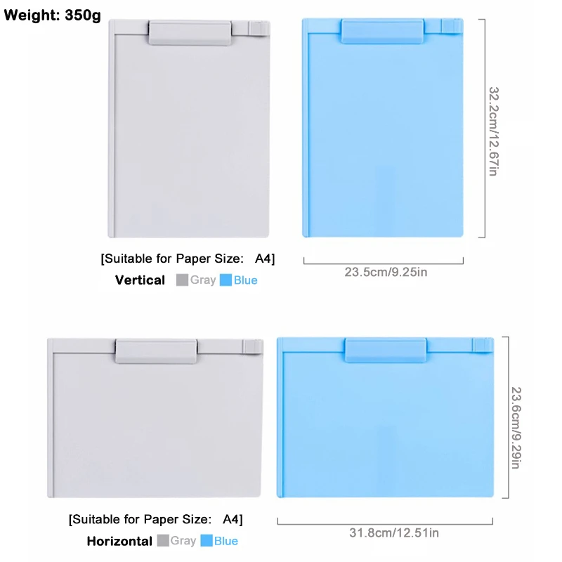 The A4 Plastic Writing Board with Clip is a versatile and durable solution for note-taking and document management. Crafted from high-quality plastic, this writing board measures 12.67 inches by 9.25 inches (vertical) and 12.51 inches by 9.29 inches (horizontal), providing ample space for A4-sized papers. It features a robust clip to securely hold documents and a built-in pen holder for added convenience. Lightweight at 0.77 pounds, this board is ideal for office, school, or on-the-go use. Available in gray and blue, it combines functionality with a sleek design, making it a practical accessory for professionals and students alike.