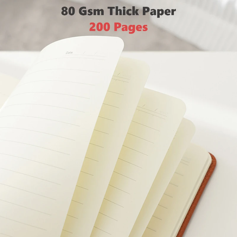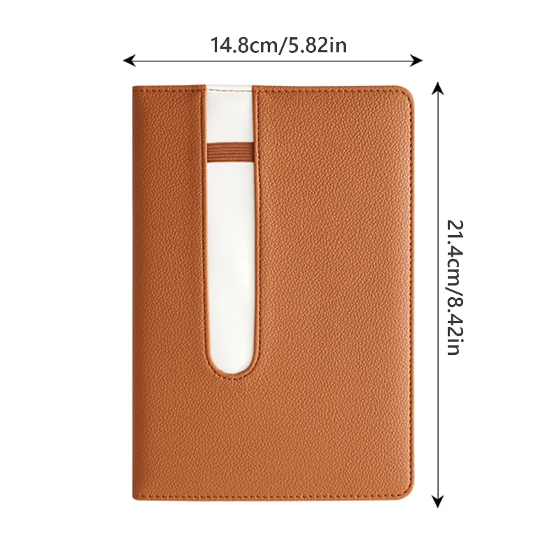 This A5 business notebook features a refined PU leather cover with a modern cutout design and built-in elastic pen holder for easy access. Measuring approximately 5.8 x 8.4 inches, it includes 200 pages of 80 gsm lined paper that provides a smooth writing experience with no ink bleed. A matching ribbon bookmark helps keep your place organized. Durable, stylish, and practical, it’s an excellent choice for meetings, note-taking, and corporate branding. Available in multiple elegant colors.