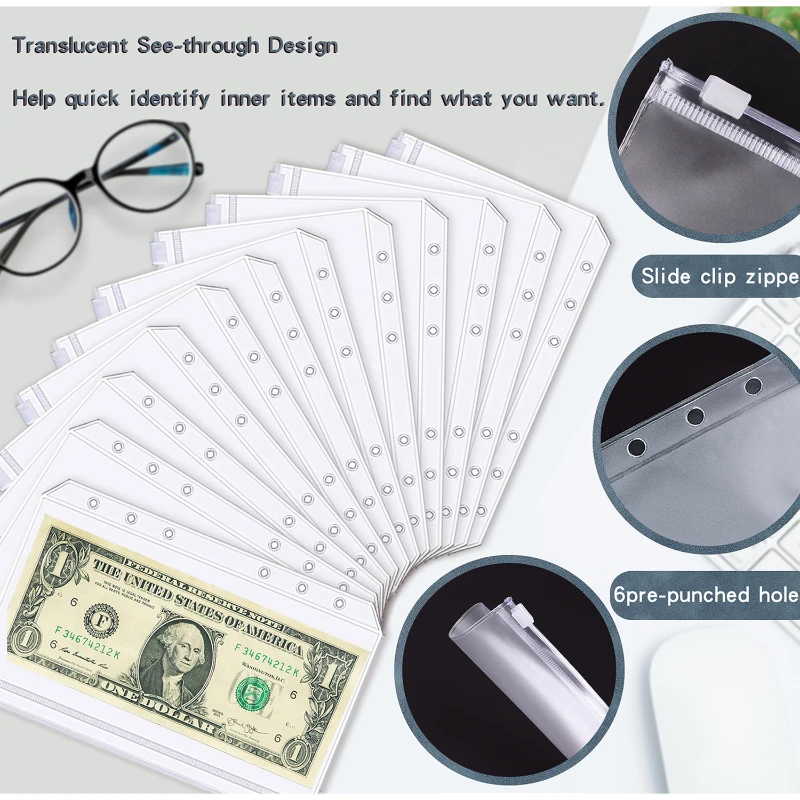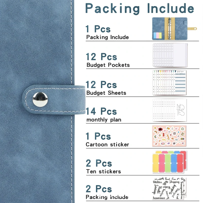 The binder is crafted from high-quality PU leather, it includes 12 transparent budget pockets, 12 budget sheets, 14 monthly plan sheets, and a variety of stickers for easy customization. The binder features a 6-ring binder mechanism, making it easy to add or remove pages as needed. The translucent design of the budget pockets allows for quick identification of contents. Perfect for those practicing cash envelope budgeting, this set is ideal for managing expenses, savings, and financial goals.