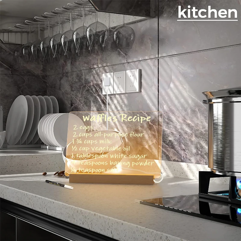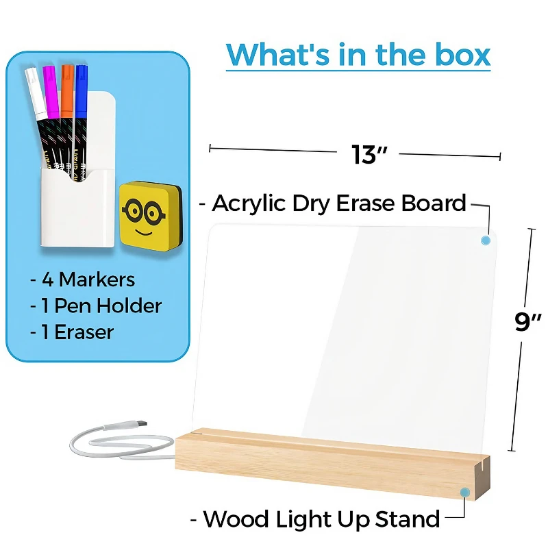 This acrylic writing board is a transparent, illuminated notice board with colored markers, serving as a desktop acrylic doodle board. Its clear transparency ensures visible messages and a glowing effect. With easy erasability, it’s an ideal desktop message board. Suitable for creative doodling and reminders, it provides a unique way to annotate in office or study spaces. Practical and decorative, it adds a touch of fun to work and study environments.