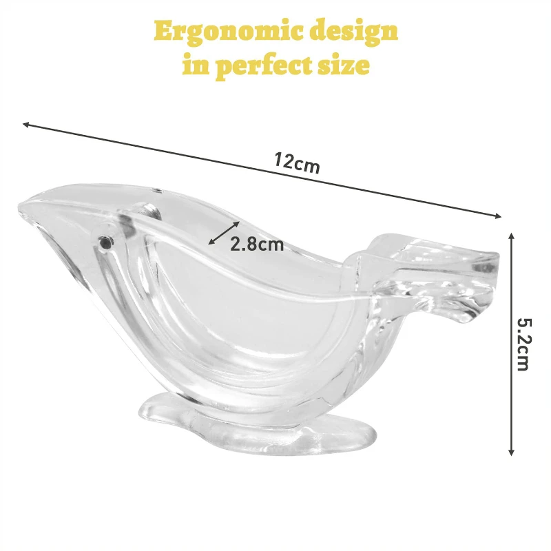 This stylish kitchen tool boasts an ergonomic bird’s beak design and smooth curves, ensuring a comfortable grip and effective squeezing. Crafted from durable, clear acrylic, the squeezer measures approximately 4.72 inches in length, 1.10 inches in width, and 2.05 inches in height, making it a perfect fit for any kitchen size. Its sturdy base and compact size ensure stability and easy storage. Whether you’re dressing salads, enhancing seafood flavors, or preparing fresh lemonade and cocktails, this squeezer is a must-have for quick and effortless juicing. The non-porous material is easy to clean and won’t absorb stains or odors, maintaining its pristine appearance over time.