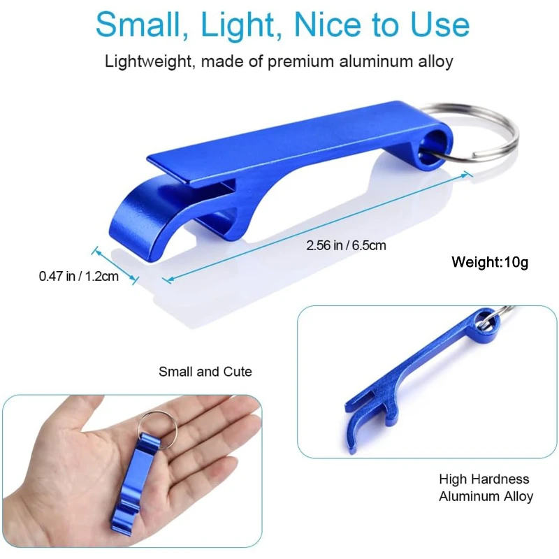 The Aluminum Alloy Bottle Opener Keychain is a sleek and practical accessory perfect for any occasion. Made from durable aluminum alloy, this bottle opener keychain is designed to last. It comes in a variety of nine vibrant colors: black, blue, light blue, green, orange, pink, purple, red, and silver, ensuring there’s a color to match everyone’s preference. Measuring 2.56 inches in length and weighing just 0.35 ounces, it’s compact and lightweight, making it easy to carry on your keyring. Ideal for opening bottles with ease, this keychain is perfect for parties, picnics, and everyday use. The sturdy keyring attachment ensures it stays securely fastened to your keys, making it a convenient and stylish tool for any beverage enthusiast.