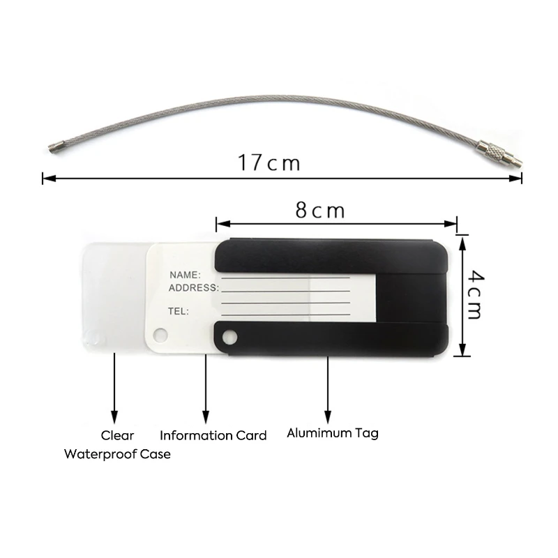 Measuring 3.15 x 1.57 inches, this lightweight tag comes with a stainless steel ring, ensuring it remains securely attached to bags during travel. It includes a waterproof clear cover and an information card for adding essential contact details. Available in 11 vibrant colors (Red, Black, Pink, Rose Red, Orange, Coffee, Silver, Purple, Gold, Green, and Blue), this tag can be customized with laser engraving, silkscreen, or full-color imprinting on front or back side, making it an ideal promotional item or personal accessory for travelers.