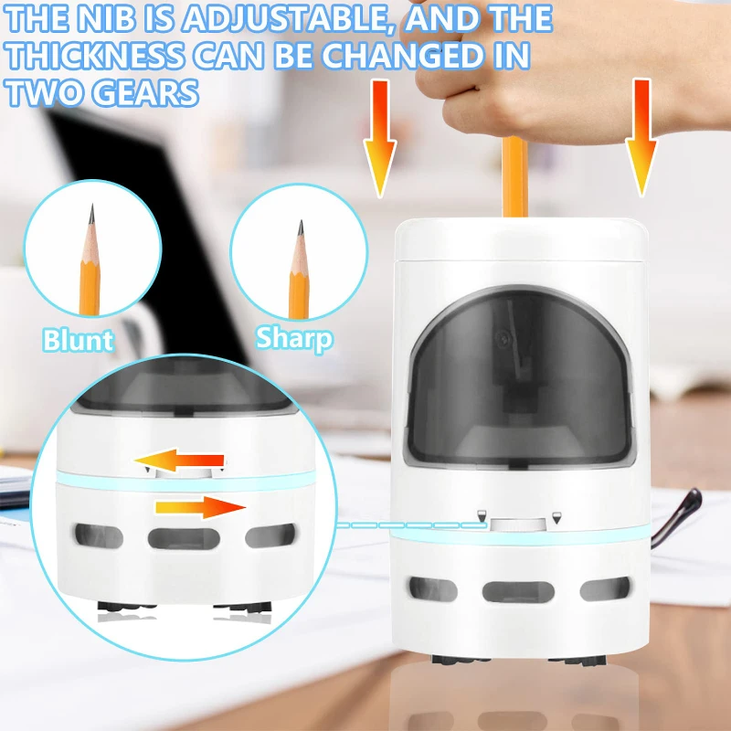 This is the desktop vacuum cleaner a creative and powerful tool for students. This pencil sharpener not only sharpens your pencils but also boasts a strong vacuum for efficient dust collection. Powered by two AA batteries (batteries not included).Ideal for maintaining a clean and organized study space, it combines functionality with creativity, making it a must-have addition to any student’s desk.