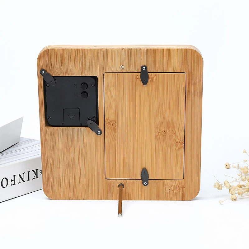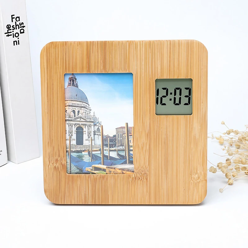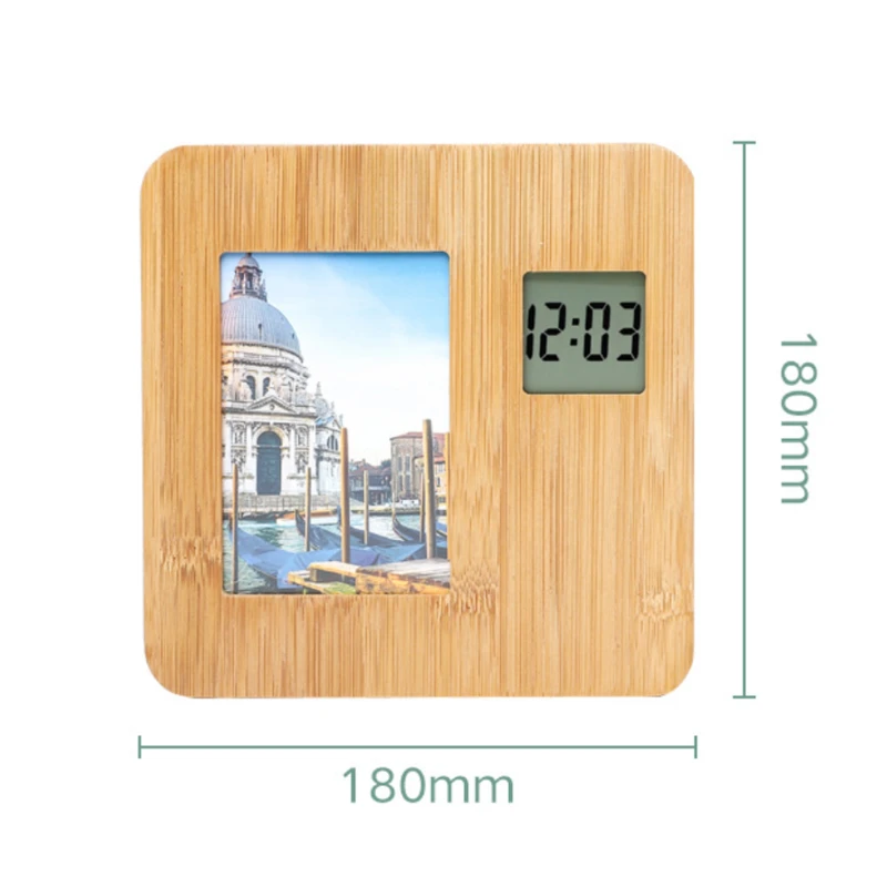Crafted from eco-friendly bamboo, this innovative accessory is not just a timepiece but also a charming way to display your cherished memories. You can put the photo you like in this clock. Powered by a button battery. The frame dimensions of 180mm x 180mm x 15mm and a weight of 300g make it an ideal size for desks and shelves without taking up too much space. It features a customizable digital clock display, ensuring you keep track of time while reminiscing over a favorite photo. The natural bamboo finish offers a warm, organic aesthetic that complements any room decor. Simple yet multifunctional, this photo frame clock is a thoughtful gift or a personal keepsake that blends seamlessly with your daily life. Note: The photo is not included.