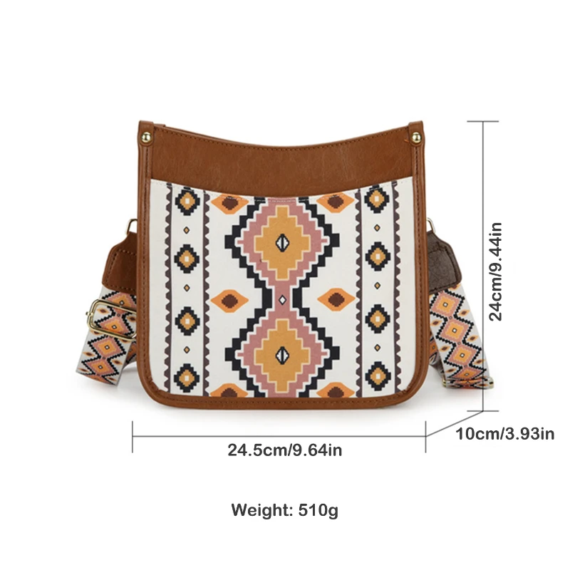 Crafted from durable PU material, it features an eye-catching geometric pattern that adds a vibrant touch to any outfit. Weighing just 1.12 lbs, this lightweight bag includes an adjustable, wide strap for comfortable wear and a spacious interior with multiple compartments to keep your essentials organized. The high-quality metal hardware and secure zipper closure ensure durability and safety for your belongings. Perfect for casual outings, festivals, or daily use.