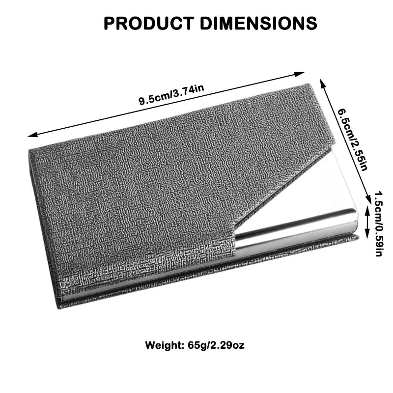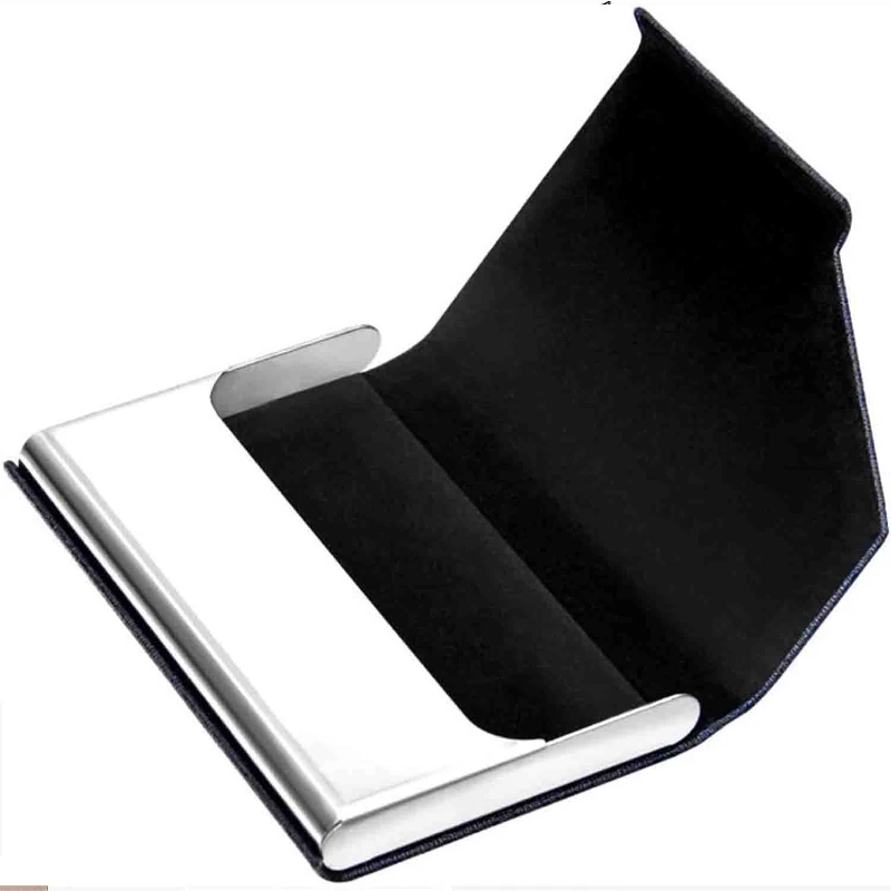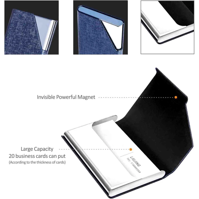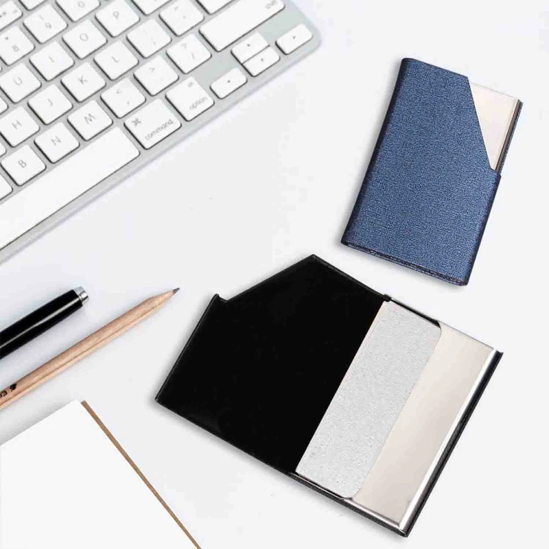 This business card holder has a unique look and is constructed of high-quality PU leather and stainless steel. The name card holder is lightweight and elegantly designed to accommodate your business cards. This card wallet has a durable design and can contain business cards as well as ID cards, credit cards, and personal cards in the interior pockets. Our business cards appear more professional thanks to this unique design, which can help you make a good impression on your key clients, business partners, or associates.