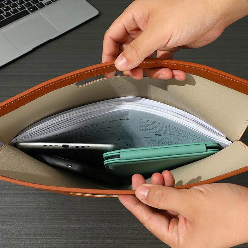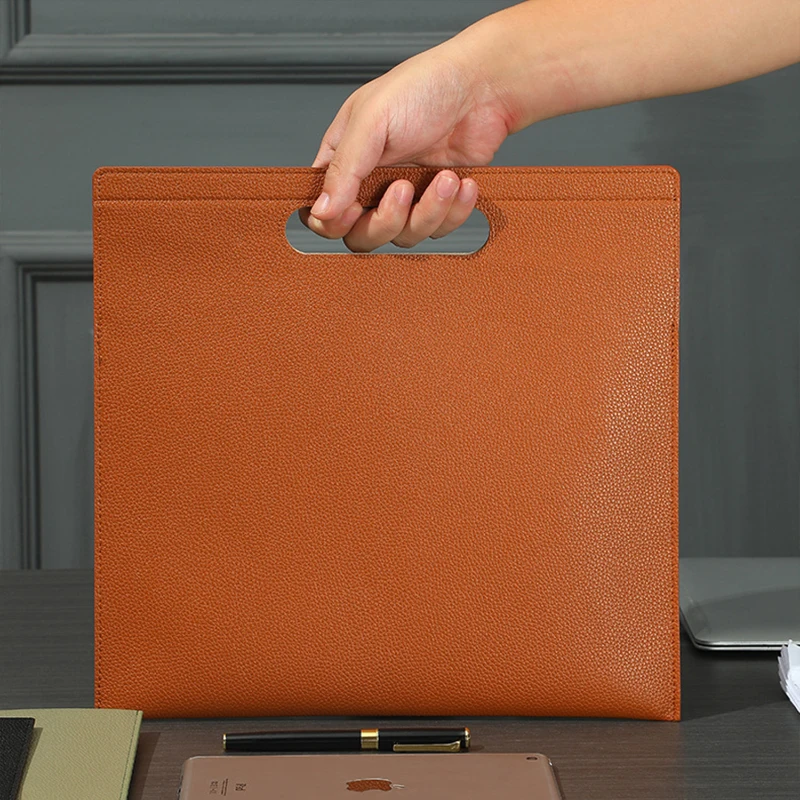 Keep your files neat and professional with this A4 PU leather document folder. Made of premium waterproof PU leather, it offers a smooth texture, fine stitching, and a soft microfiber interior for extra protection. Measuring 13.26 × 12.6 inches, this slim yet spacious folder easily fits A4 papers, tablets, and notebooks. The built-in handle allows easy carrying without adding bulk. Ideal for office, school, business meetings, or travel, it combines practicality with a modern minimalist look. Available in multiple elegant colors.