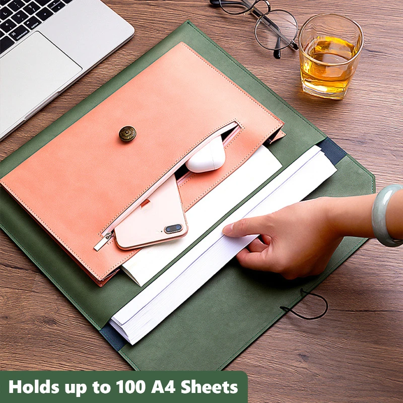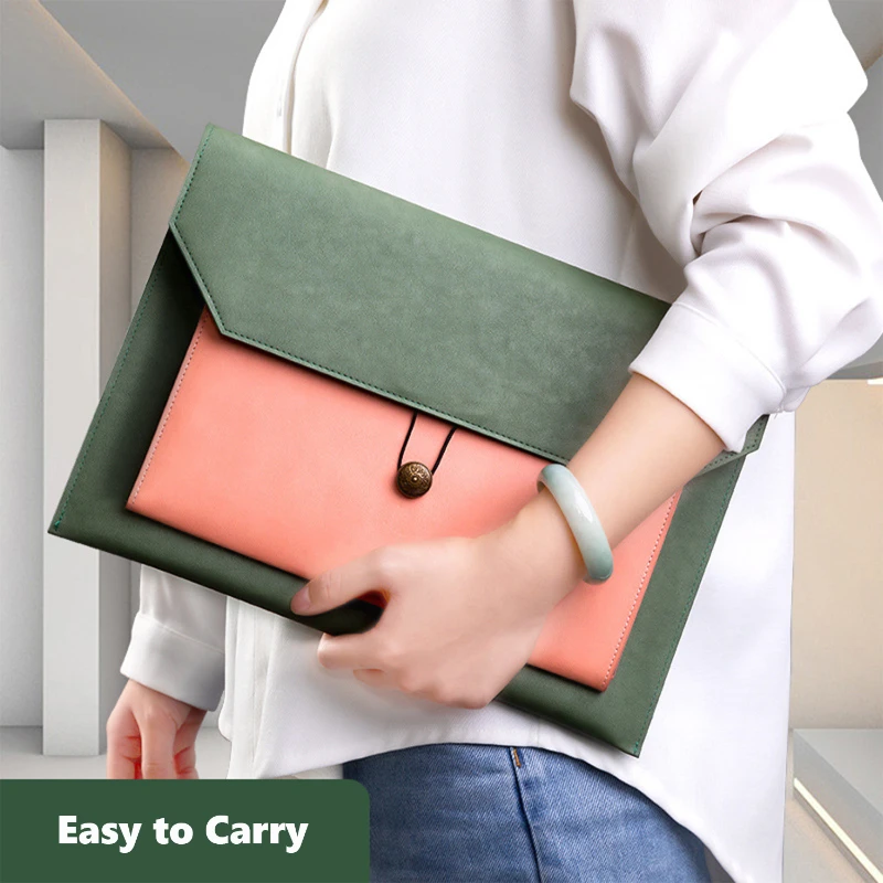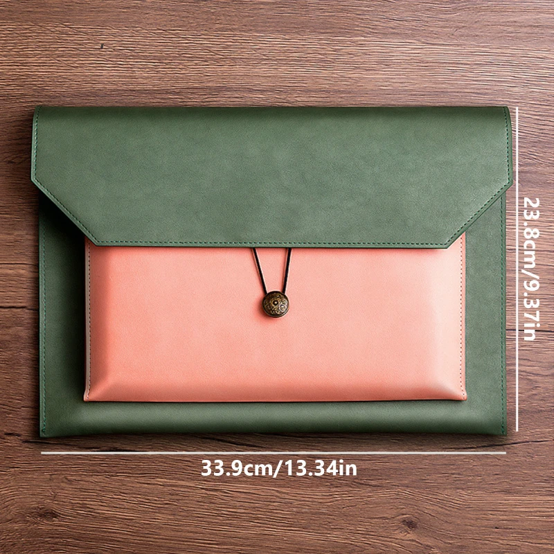 This elegant PU leather envelope document folder is designed to keep your important papers and devices protected in style. Measuring 13.34 × 9.37 inches, it features a smooth leather surface with fine stitching and a dual-pocket design—one large compartment for A4 documents, tablets, or notebooks, and a smaller front pocket for phones or accessories. The secure button-and-string closure adds a classic touch while preventing items from slipping out. Lightweight and durable, it’s ideal for business meetings, office use, school, or travel. Available in five vibrant colors to match your professional style.