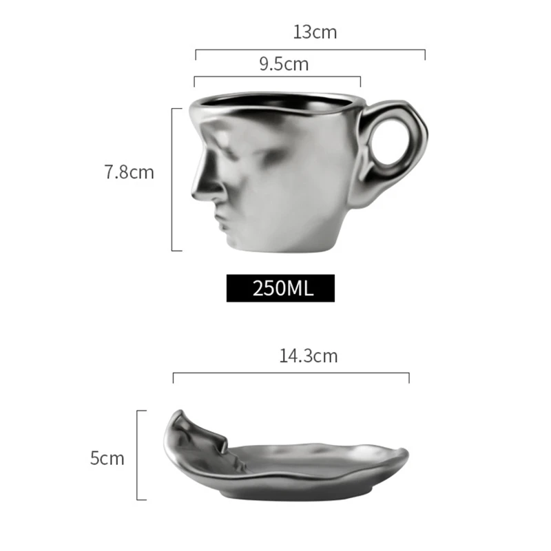 Each set features a unique 250ml capacity cup and saucer, artistically crafted to depict a serene face with a kissable counterpart, symbolizing companionship and affection. Measuring 13cm from handle to saucer edge with the cup standing at 7.8cm tall, this charming set brings a touch of romantic artistry to your coffee experience. Made from high-quality ceramic, the mug and saucer offer a delicate yet durable way to enjoy your favorite beverages. Whether for a peaceful morning coffee or a relaxing evening tea, this set not only serves as a functional drinkware piece but also as a conversational artwork in any setting.