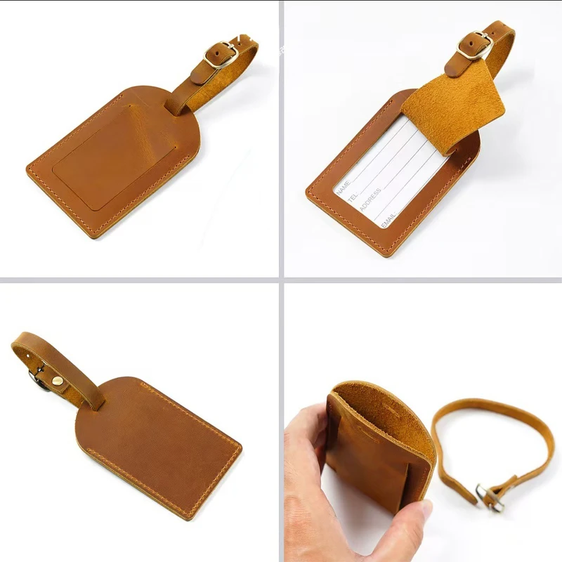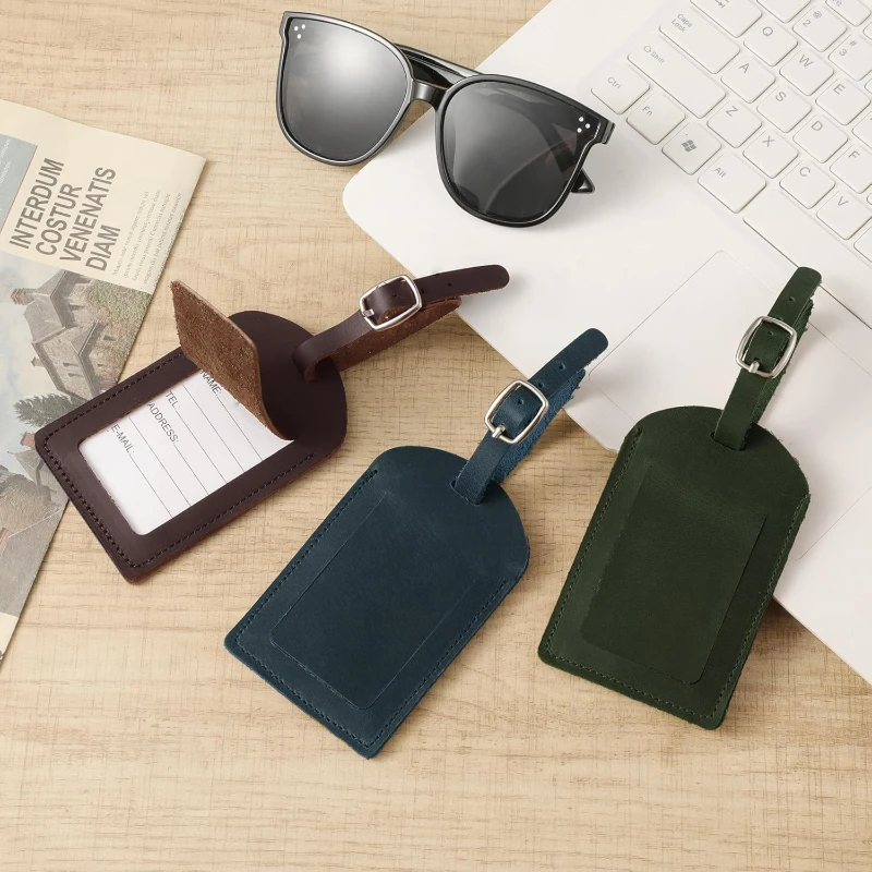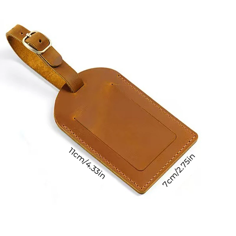 This classic luggage tag is crafted from genuine leather with a smooth surface and firm, durable structure. Designed with a privacy flap, it protects personal information while allowing easy access to the included printed ID card through a clear waterproof PVC window. Finished with reinforced stitching and an adjustable leather strap with metal buckle for secure attachment to suitcases, carry ons, and travel bags. Measuring approximately 4.33 x 2.75 inches, this leather luggage tag is ideal for frequent travel, business use, and premium branding programs.