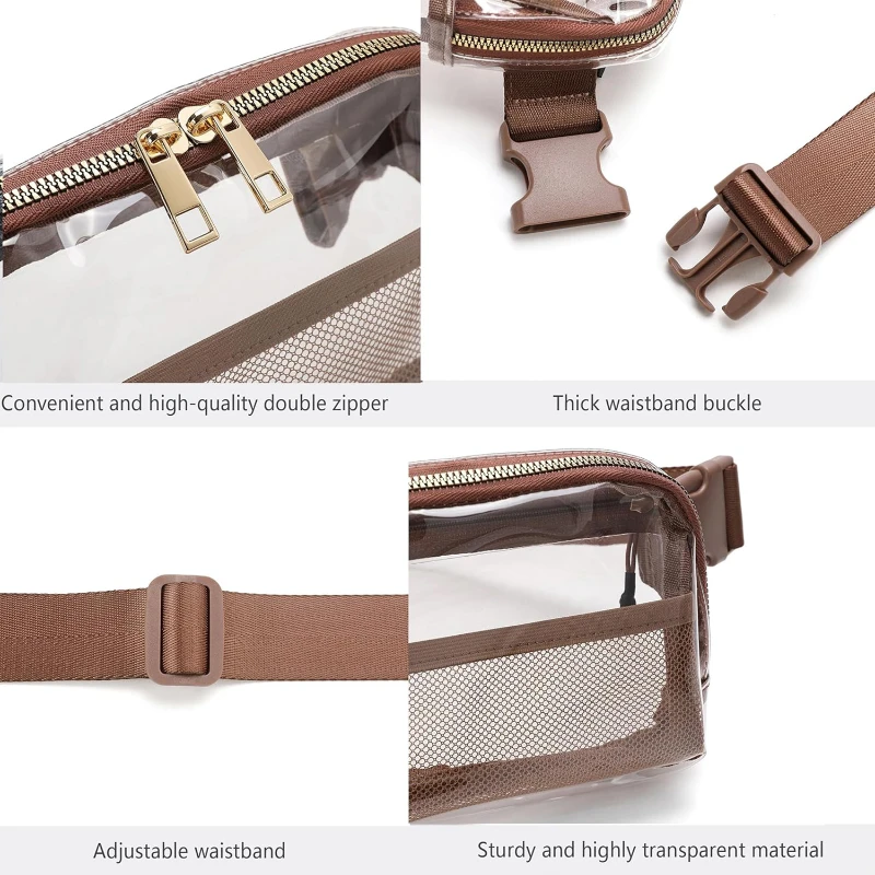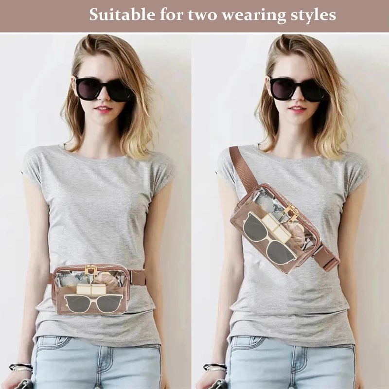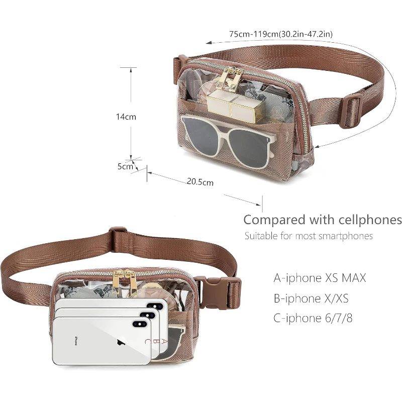 This Clear Adjustable Fanny Pack offers practicality and style with its transparent design made from durable TPU material. Weighing just 0.34 pounds, it features a convenient double zipper, a thick waistband buckle, and an adjustable strap ranging from 30.2 to 47.2 inches, ensuring a comfortable fit for all users. The pack measures 8.1 x 5.5 x 2 inches, making it spacious enough to carry essentials like sunglasses, phones, and cosmetics. Perfect for events, travel, or daily use, this fanny pack keeps your items secure and easily accessible while complying with stadium and event venue regulations. Available in various colors.