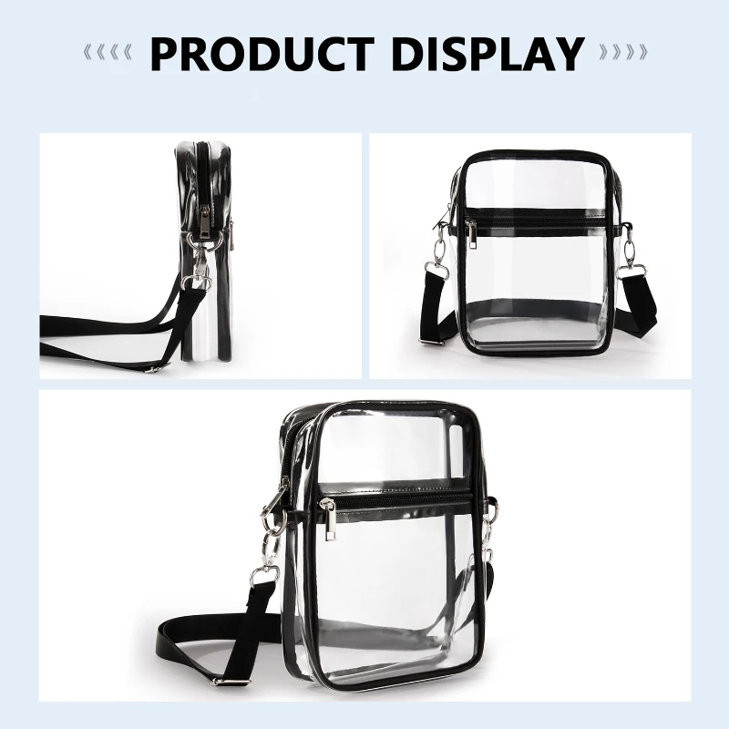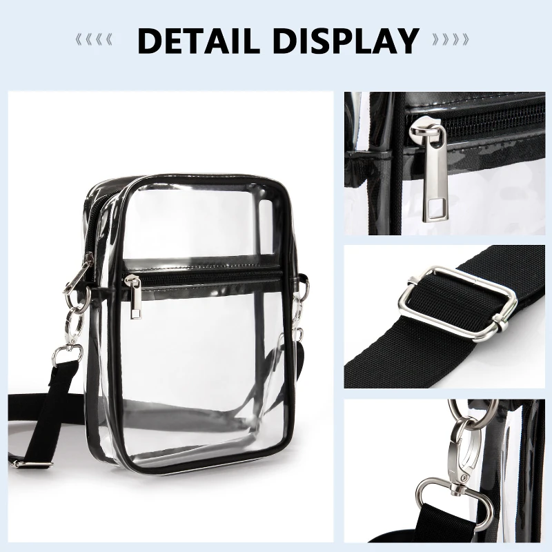 Made of Pvc. This bags have two sizes to choose from: Large and Small. This bag is just the right size for a small wallet, phone, lipstick, pen, tissues, hat, sunglasses, and more, all at once.. It’s lightweight and has an adjustable strap so it can be used as a shoulder bag or a cross-body bag. Works great for a concert or a game where clear bags are required.