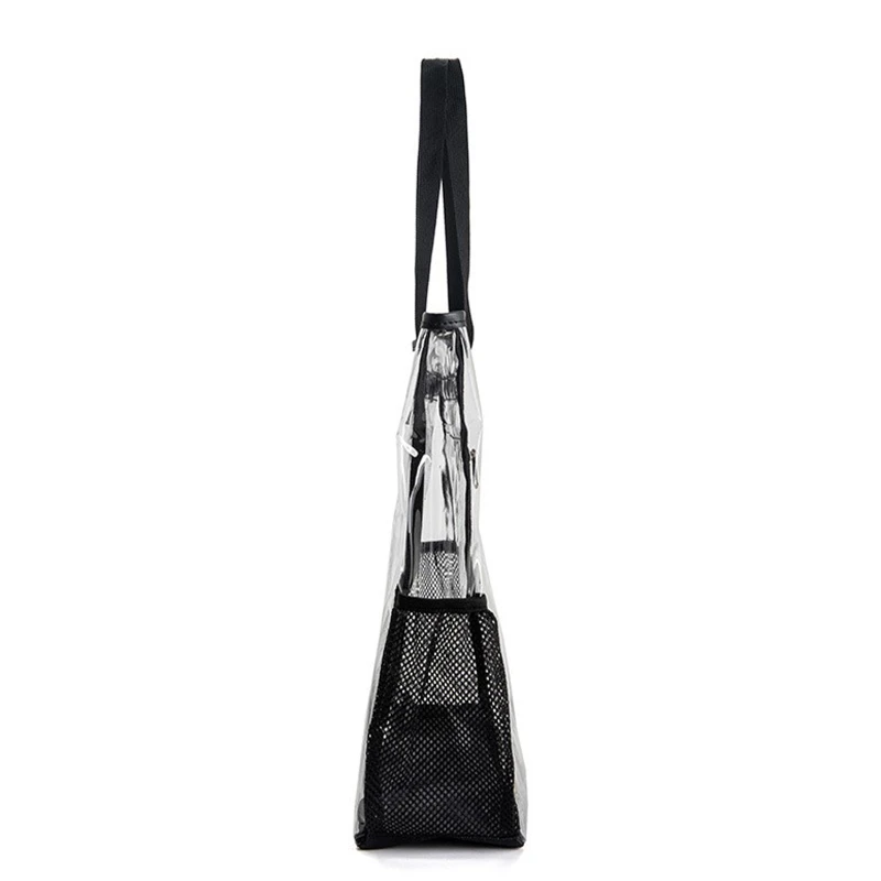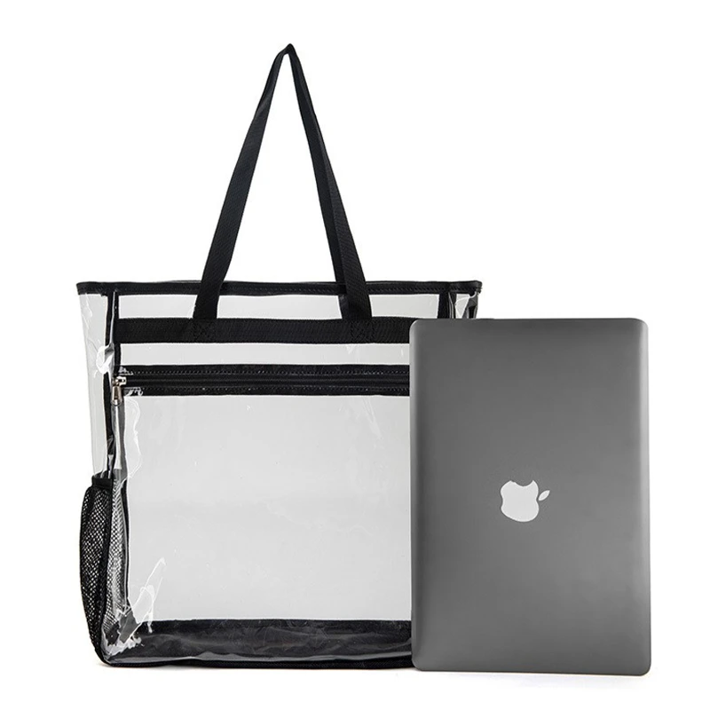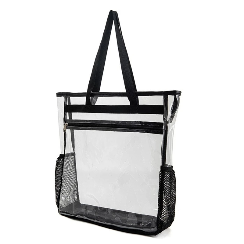 This spacious and durable tote bag is crafted from 0.3mm transparent PVC material, ensuring both visibility and sturdiness. Measuring 15.72 inches in length and 15.72 inches in height, it provides ample storage for a variety of items such as umbrellas, iPads, cosmetics, and books. The bag features a main compartment, a front zippered pocket, and side mesh pockets for additional storage.