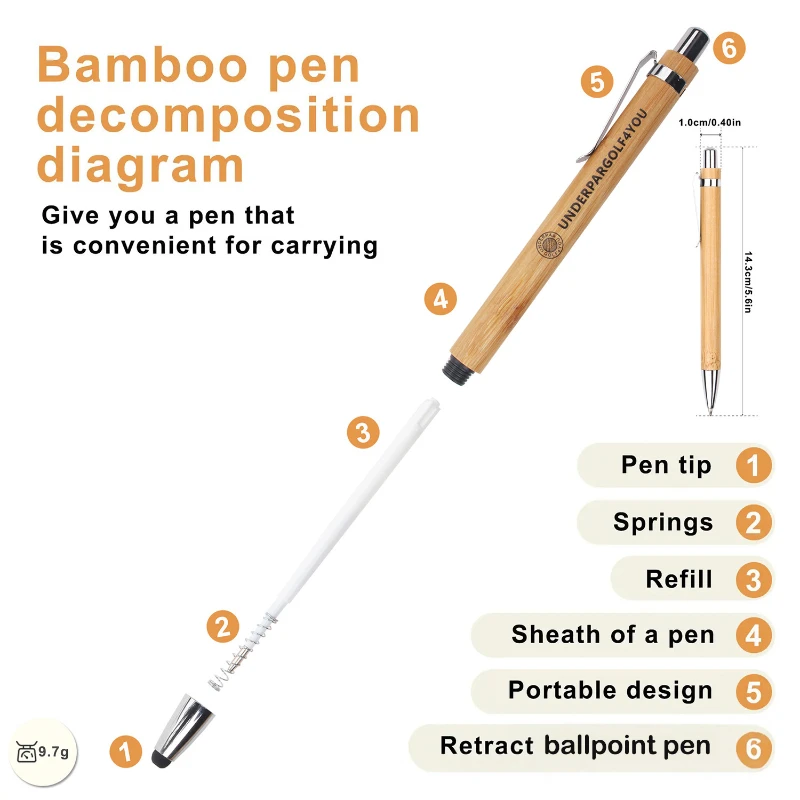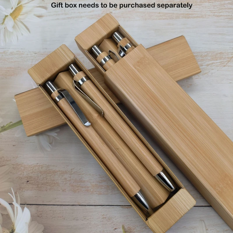 Crafted from sustainable bamboo and durable metal, it features a sleek retractable design, making it an ideal choice for eco-conscious professionals. The pen is lightweight at only 9.7 grams and measures 5.6 inches in length and 0.4 inches in diameter, ensuring comfortable handling. The natural bamboo finish provides an elegant look that can be customized with your logo, perfect for corporate gifting and promotional events. An optional gift box is available for purchase to enhance presentation and gifting experience.