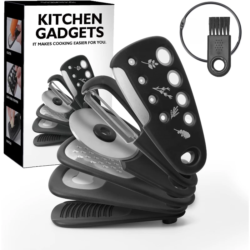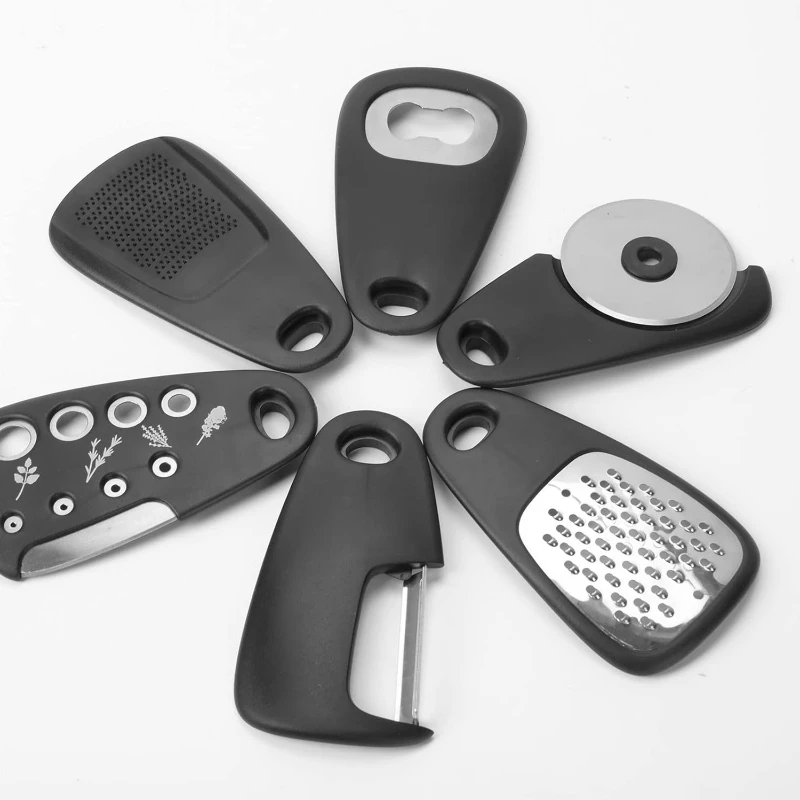 The Compact Camper 6-in-1 Kitchen Gadget Ensemble is an innovative collection tailored for adventurers and camping enthusiasts. It includes a pizza cutter for effortless slicing, a fruit peeler for easy snack prep, an herb stripper to quickly add fresh flavors, a versatile bottle opener, and a grinder & grater duo for perfect garnishes. Constructed from durable stainless steel, these tools are designed to withstand outdoor cooking demands. The set’s smart, space-saving design makes it a necessity for RVs, campers, and even small apartments. Each gadget is ergonomically designed with a black handle, providing a comfortable grip during use. This ensemble is an essential utility set for efficient, compact, and versatile kitchen preparation, making it a fantastic gift outdoor lovers.
