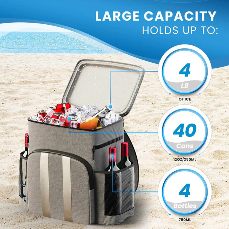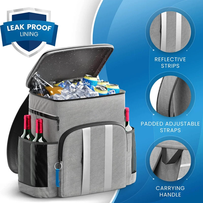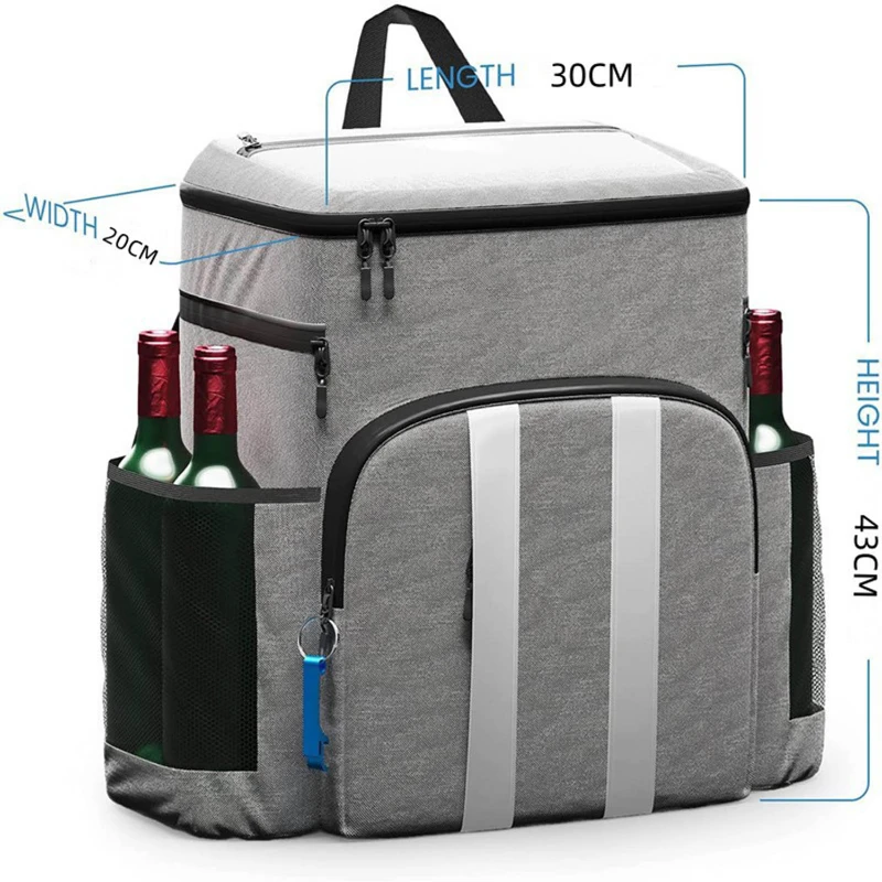 Cooler Backpack – Insulated, Leak-Proof, and made from 300D Oxford fabric. With dimensions of 16.93 in x 11.81 in x 7.87 in, it offers an ample 45-can capacity, keeping items cool for up to 20 hours. It also features a dual wine bottle holder with a cover and even includes a bottle opener. The leak-free zipper and liner, combined with multiple pockets, enhance functionality. Plus, a reflective strip on the front ensures travel safety. Ideal for travel, picnics, and corporate gatherings.