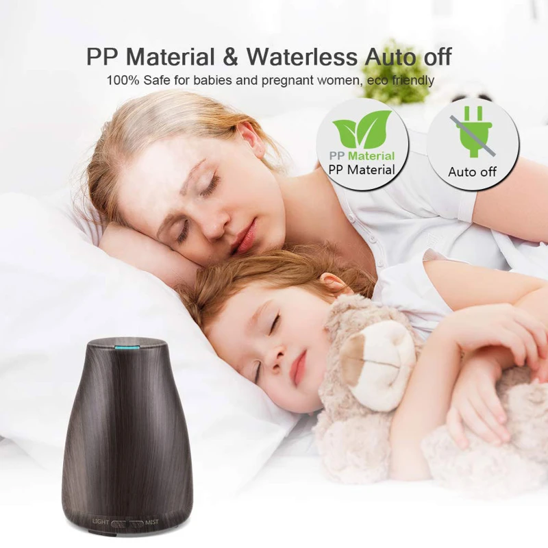 The essential oil diffuser can generate much more mist and last longer without taking much space in your room. An ideal way to increase humidity (moisture) in a single room. Choose between 7 colors that can be set to cycle through or on one specific color. Put it in the room as a nightlight to help get a restful sleep. This diffuser adopts PP material with wood grain, which adds a sense of natural grace to your room.