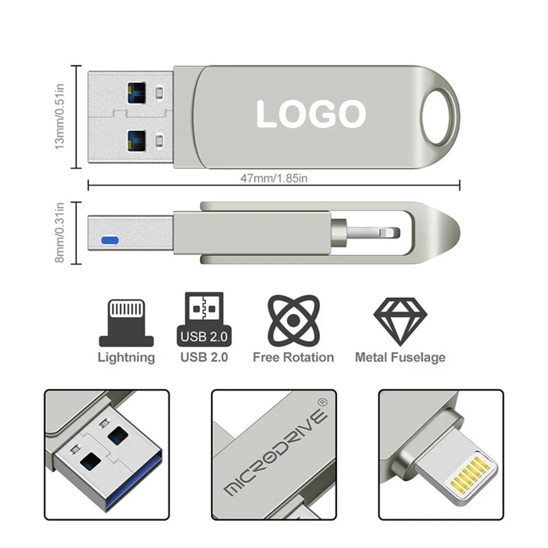 This dual-port USB 3.0 flash drive provides seamless data transfer and expansive storage options with capacities of 64GB, 128GB, and 256GB. Available in two sleek colors, black and silver, this drive features a rotating metal design for durability and portability. Ideal for use with PCs, Macs, iPhones, iPads, and other USB-compatible devices, it ensures fast, reliable data access and transfer. Customizable with laser or silk-printed logos, it’s a perfect promotional item for corporate events or tech-savvy giveaways.