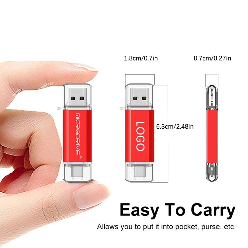 This dual interface USB-C flash drive offers a seamless solution for data transfer between USB Type-C and USB 2.0 devices. Available in storage capacities of 8GB, 16GB, 32GB, 64GB, and 128GB, it ensures ample space for your files. The flash drive is lightweight at just 0.02 lbs (11g) and measures 2.48 inches (6.3 cm) in length, 0.7 inches (1.8 cm) in width, and 0.27 inches (0.7 cm) in thickness, making it easy to carry in your pocket, purse, or bag. Choose from four vibrant colors: red, blue, white, and black. Custom branding is available with laser engraving or silk printing for a personalized touch.