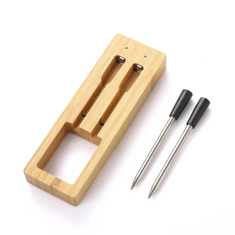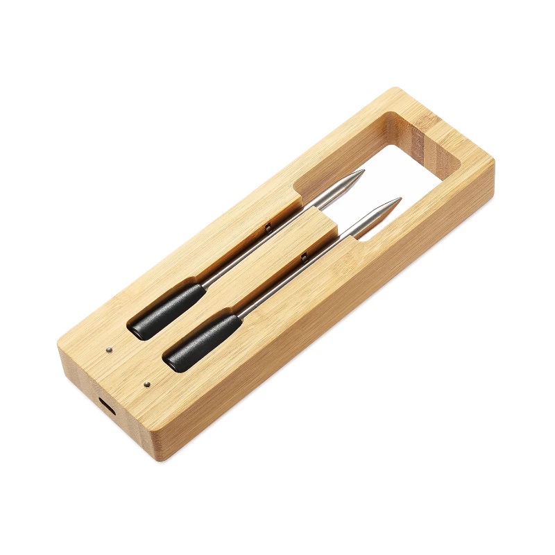 This dual-probe wireless thermometer is perfect for precise temperature monitoring during BBQs, grilling, and kitchen cooking. It features a temperature range of minus 4 to 221 degrees Fahrenheit (minus 20 to 105 degrees Celsius) with heat-resistant casing that can withstand up to 572 degrees Fahrenheit (300 degrees Celsius). Its Bluetooth 5.1 technology offers a strong signal transmission of up to 164 feet (50 meters) and enables simultaneous monitoring of multiple probes through a mobile app. USB rechargeable, the thermometer operates for over 48 hours after a quick 10-minute charge. The bamboo storage base adds an eco-friendly touch.