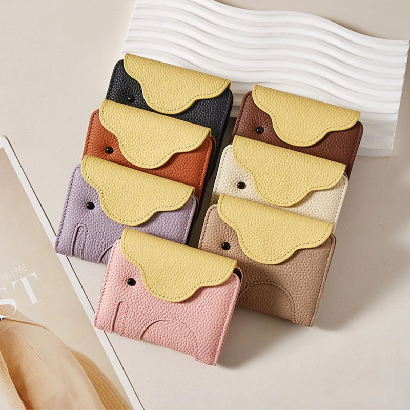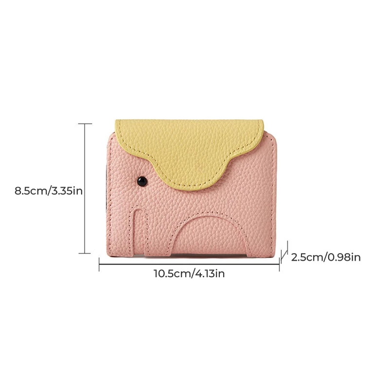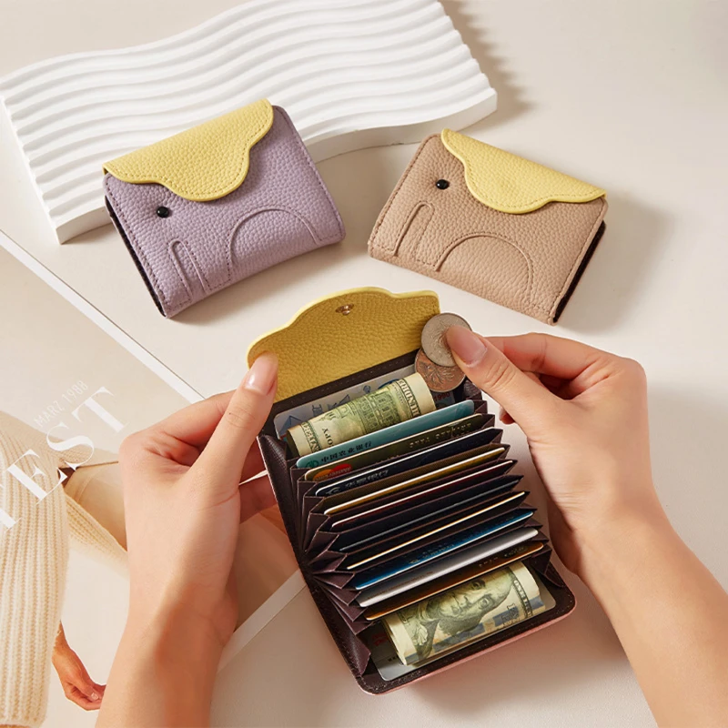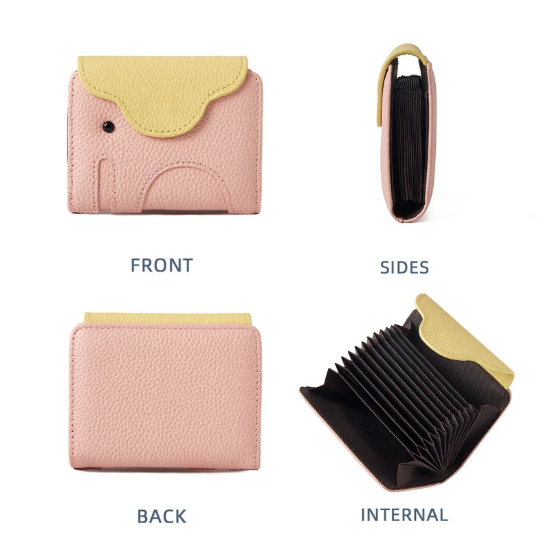 Accordion style card wallet made from top-grain leather with a soft pebbled texture and playful elephant design flap. Measures 4.13 x 3.35 x 0.98 inches, offering compact size with large storage capacity. Features 12 card slots with expandable compartments to organize credit cards, ID cards, business cards, folded cash, and coins. Secure snap closure keeps contents protected while allowing quick access. Durable stitching and structured interior provide reliable everyday use. Ideal for travel, daily carry, corporate gifts, trade shows, and promotional programs. Available in Beige, Black, Yellow, Dark Brown, Purple, and Pink.