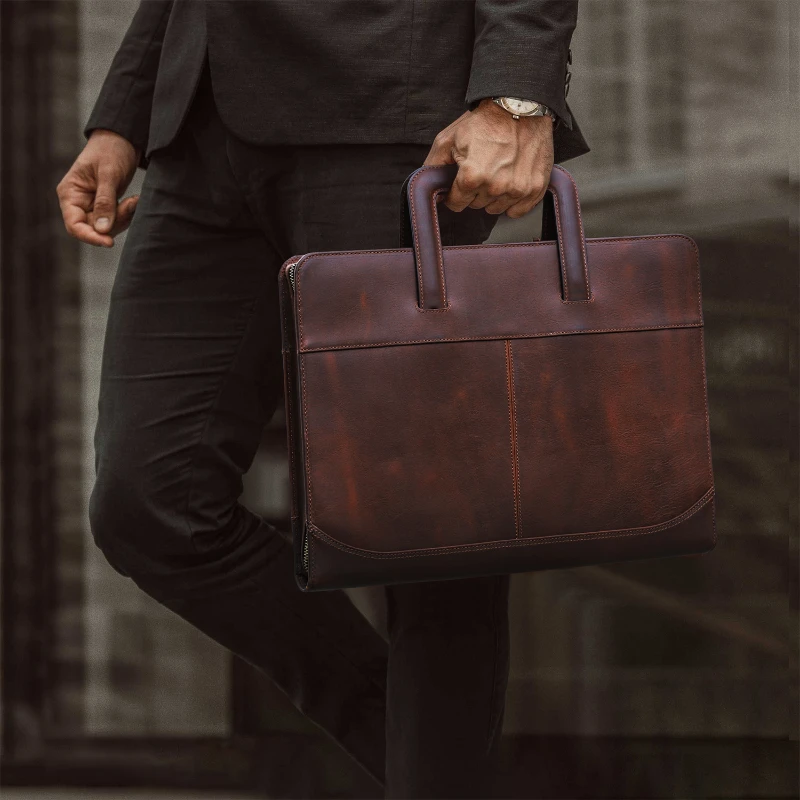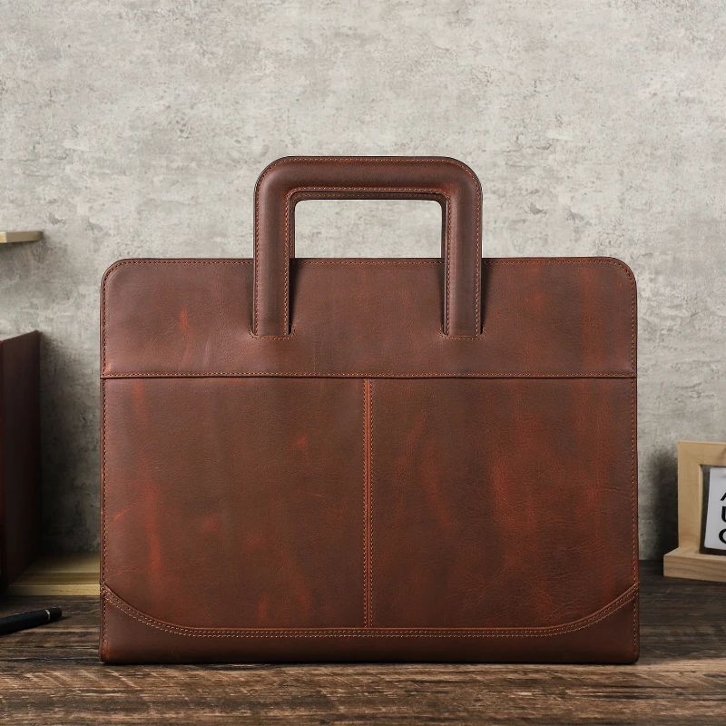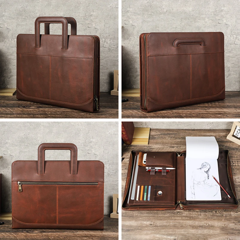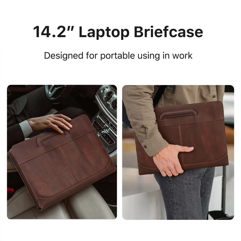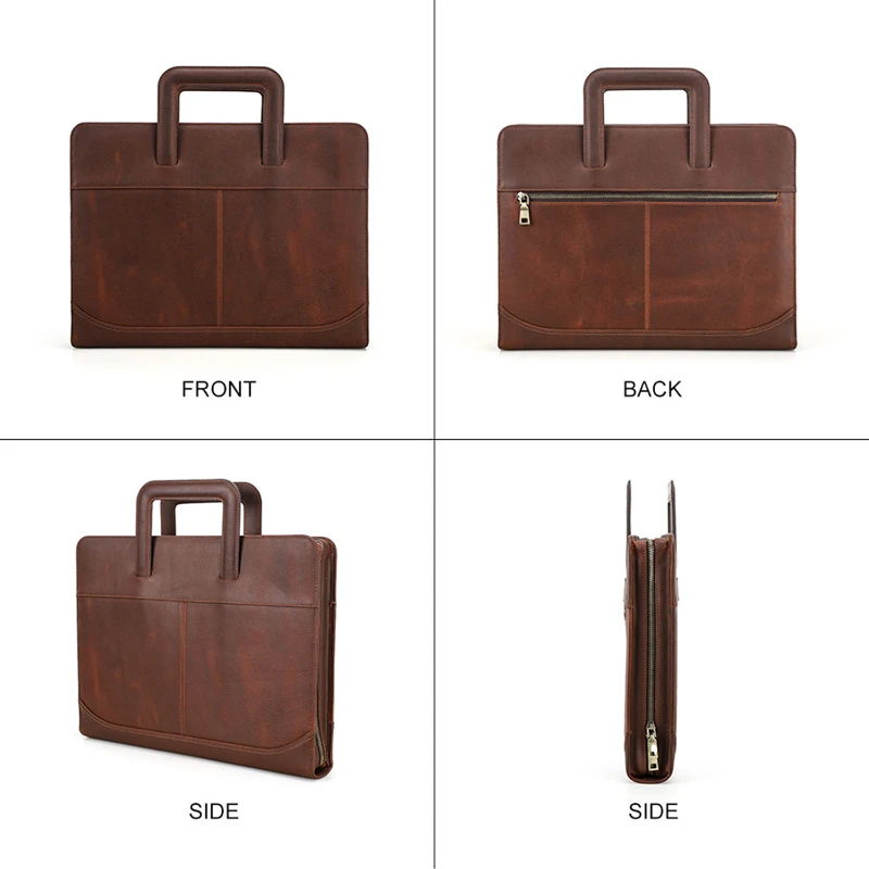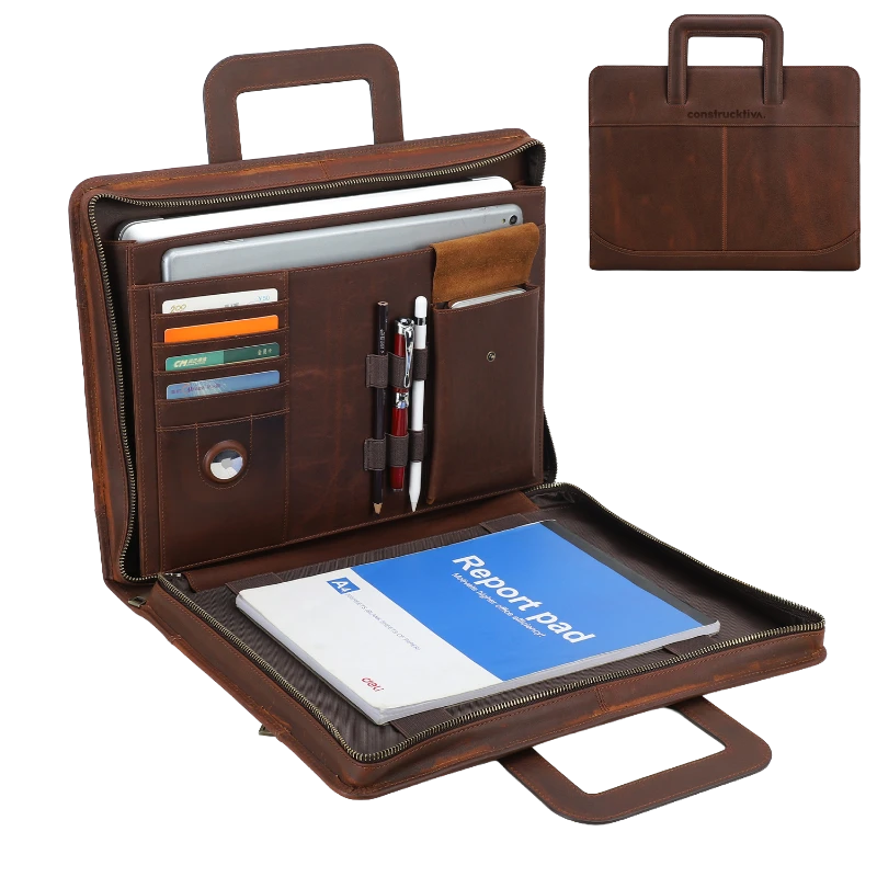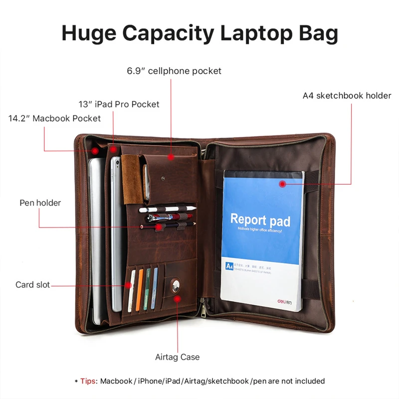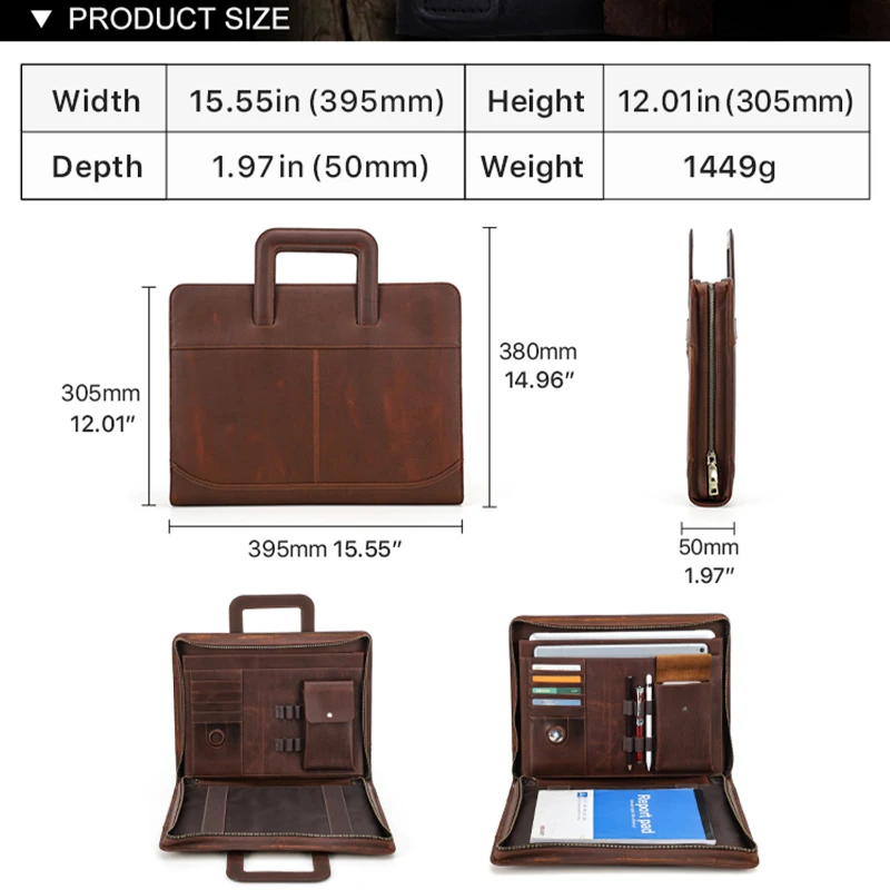 Crafted from premium full-grain cowhide leather in a rich coffee color, this zip-around padfolio offers classic style and everyday function. Measures 15.6 W x 12.0 H x 2.0 D inches and weighs approximately 3.2 lbs. Designed to fit up to a 14.2 inch MacBook, 12.9 inch iPad, and A4 documents. Features RFID blocking card slots, built in AirTag holder, multiple pen loops, phone pocket, interior zip compartment, and secure document sleeve. Smooth metal zipper closure and sturdy top handle provide easy portability. Ideal for executive meetings, conferences, and corporate gifting.