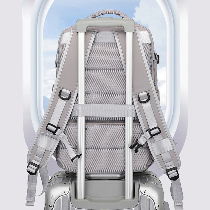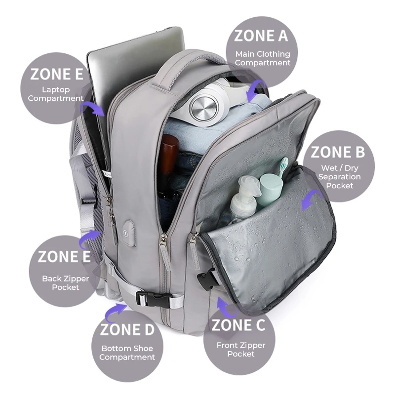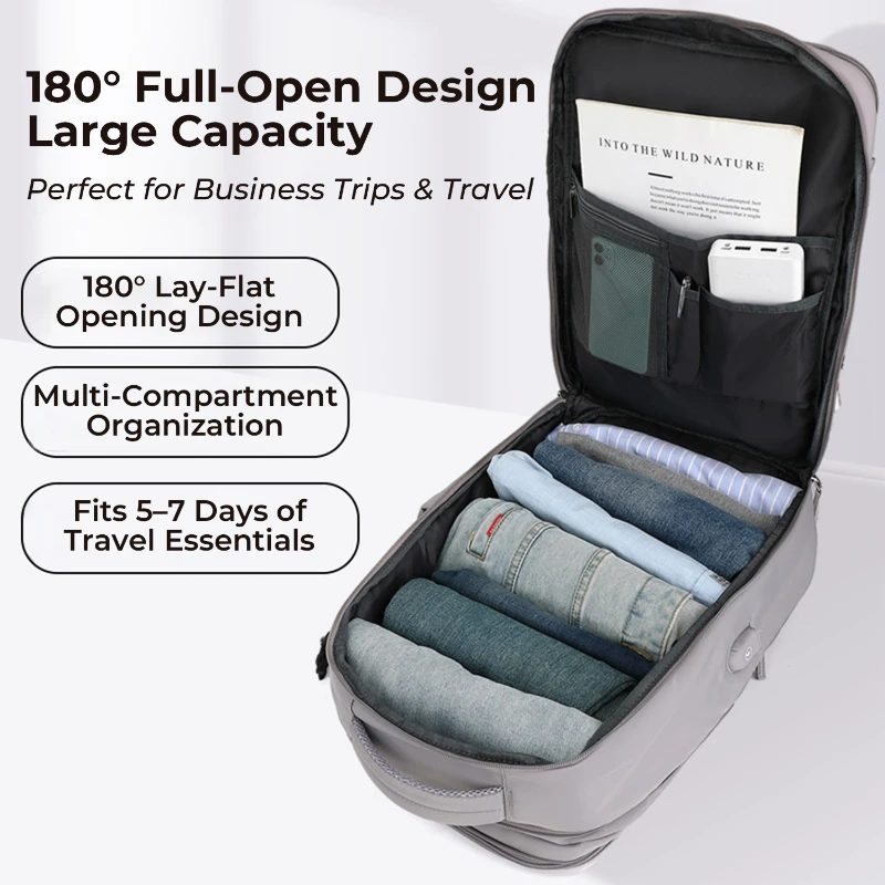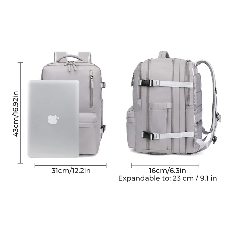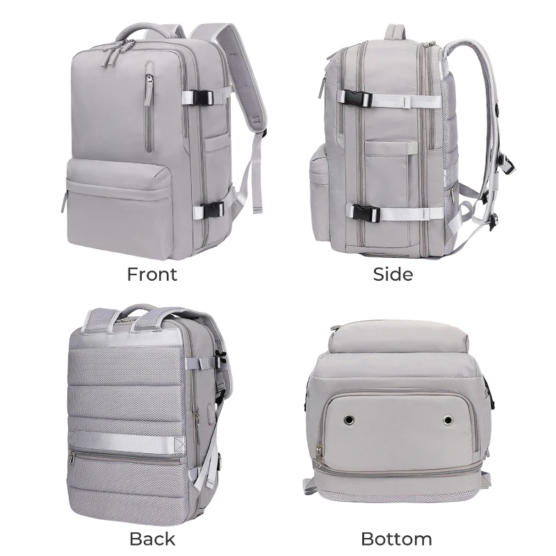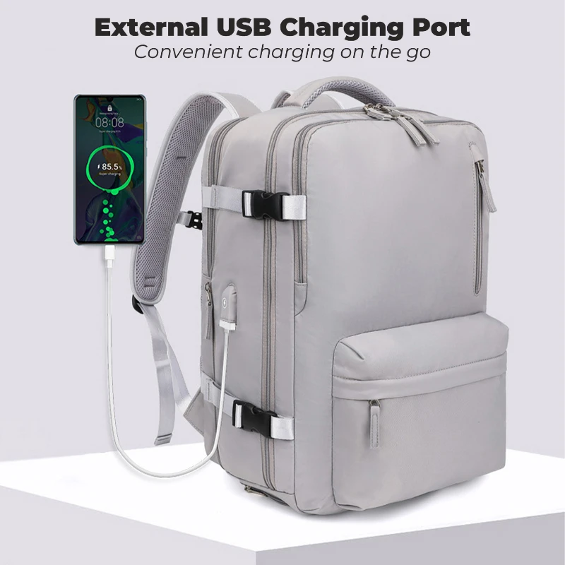 This expandable travel laptop backpack is designed for daily commuting, leisure travel, and short trips. Made from durable Oxford cloth and polyester, it features a clean minimalist design with a hidden expansion zipper that increases depth by approximately 7 cm. The structured multi compartment layout includes a padded laptop compartment fitting up to 16 inch laptops, a large main clothing compartment with 180 degree full open design, a bottom shoe compartment to separate footwear, and a wet dry separation pocket for toiletries or damp items. An external USB charging port allows convenient charging with your own power bank not included. Breathable padded shoulder straps and mesh back panel help reduce carrying pressure. Water repellent fabric protects contents from light rain.