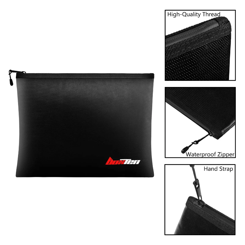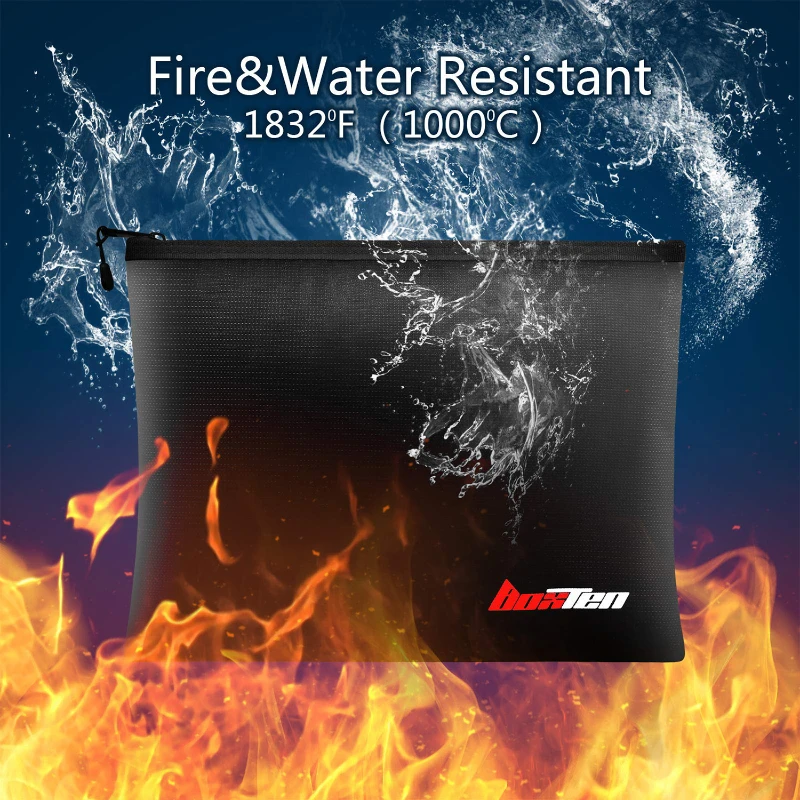 This fireproof and waterproof document pouch offers premium protection for your valuables. Made of high quality non-itchy silicone coated fiberglass which stands up the high temperature. Measuring 13.4 x 9.8 inches, this pouch is perfect for safeguarding important documents, passports, cash, and electronics. It is lightweight, weighing only 0.48 lbs (220g), and comes with a waterproof zipper and convenient hand strap, making it ideal for home, office, or travel use.
