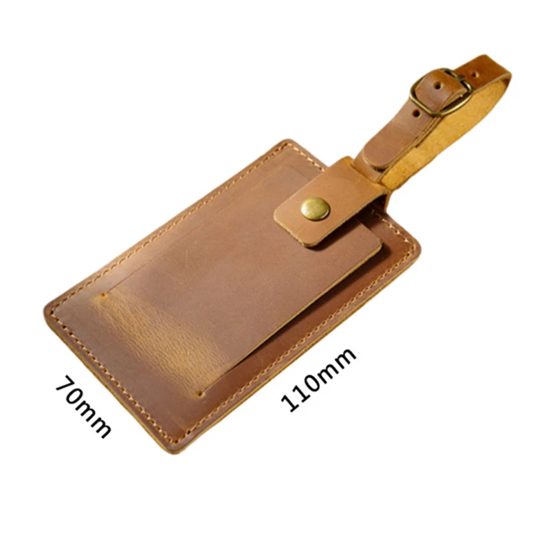 This travel luggage tag is made of full-grain crazy horse leather for a durable and vintage look. Measuring approximately 4.3 x 2.8 inches and weighing 0.09 lb, it features a secure buckle strap and a snap cover to protect personal information. Designed for both style and function, it is ideal for air travel, business trips, or holiday luggage. Available in multiple classic colors, it supports custom branding through embossing, silkscreen, foil stamping, or UV digital printing. Each piece is lightweight and practical for frequent travelers.