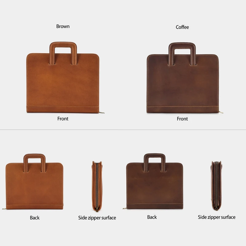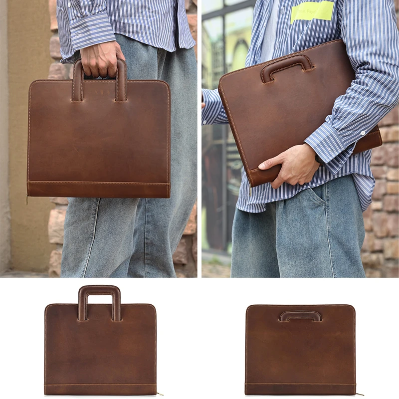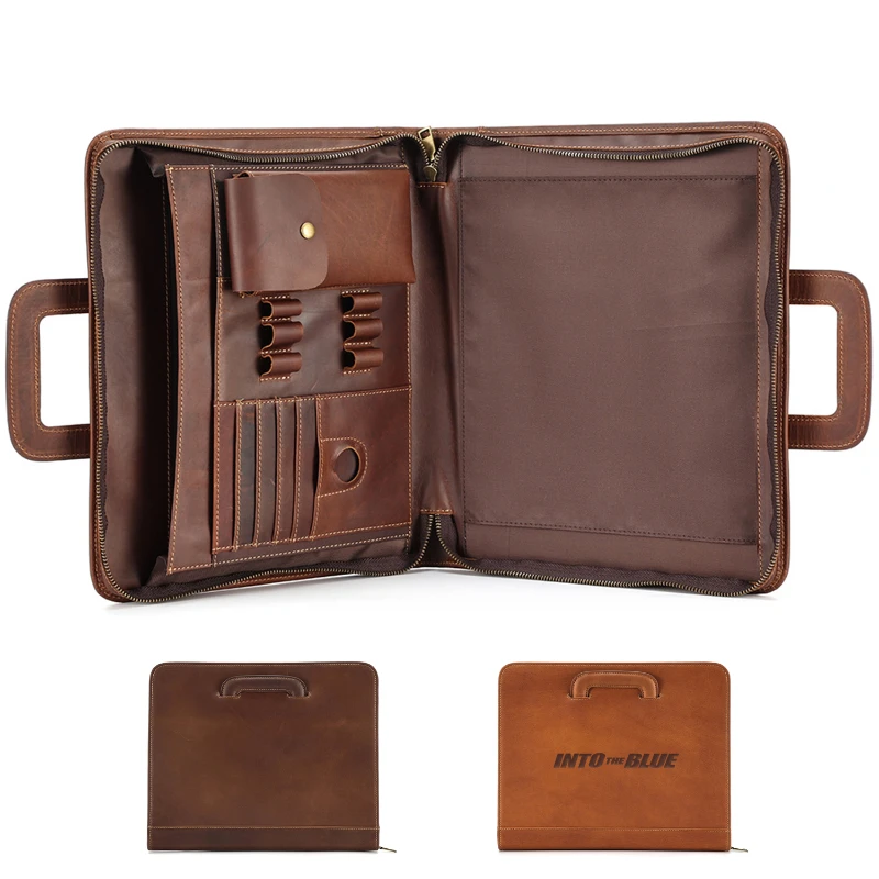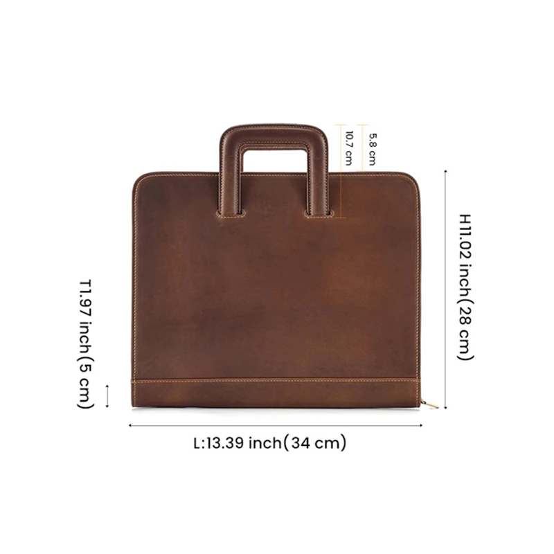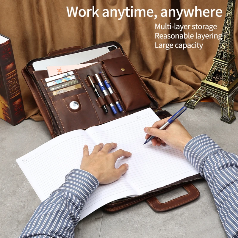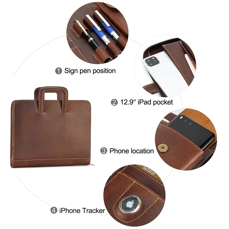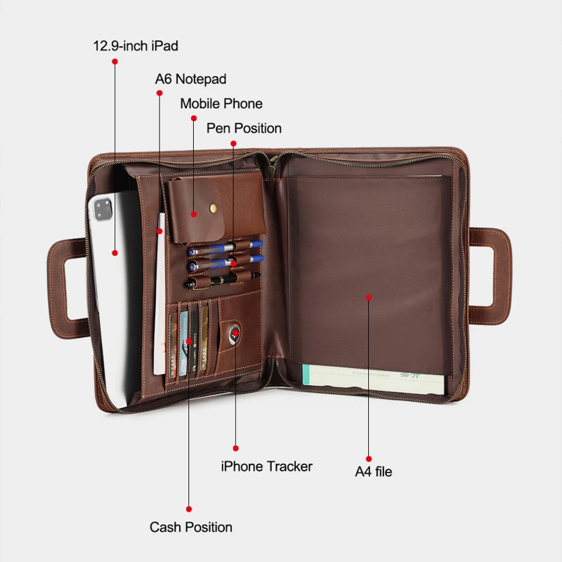 This multifunctional padfolio is crafted from premium full grain crazy horse leather, combining elegance with everyday practicality. Measuring 13.4″L x 11″H x 2″T, it fits a 12.9″ iPad and includes compartments for phone, A6 notebook, A4 documents, cards, pens, and cash. The built-in AirTag holder and dual handles offer convenience for business or travel. Its durable construction, smooth zipper, and vintage leather finish make it an excellent choice for professionals seeking both function and sophistication.