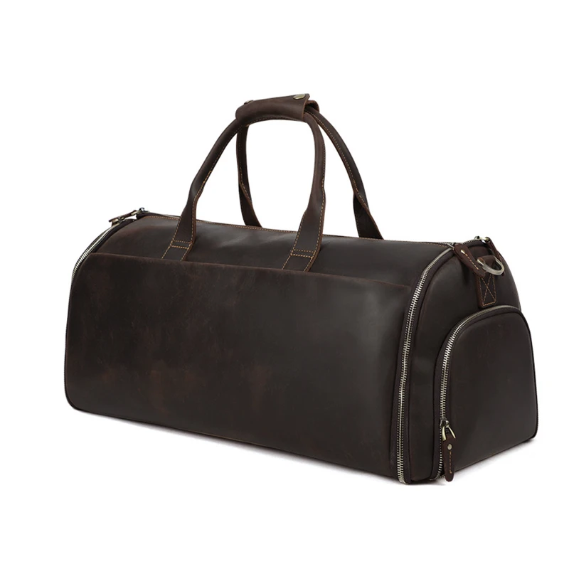 Crafted from high-quality genuine leather, this garment bag is designed to keep your clothes wrinkle-free and neatly organized while on the go. The convertible design allows you to use it as both a garment bag and a duffel bag, providing you with convenience and flexibility during your travels. When folded, it easily transforms into a compact duffel bag, perfect for overnight trips or weekend getaways.