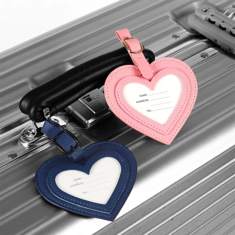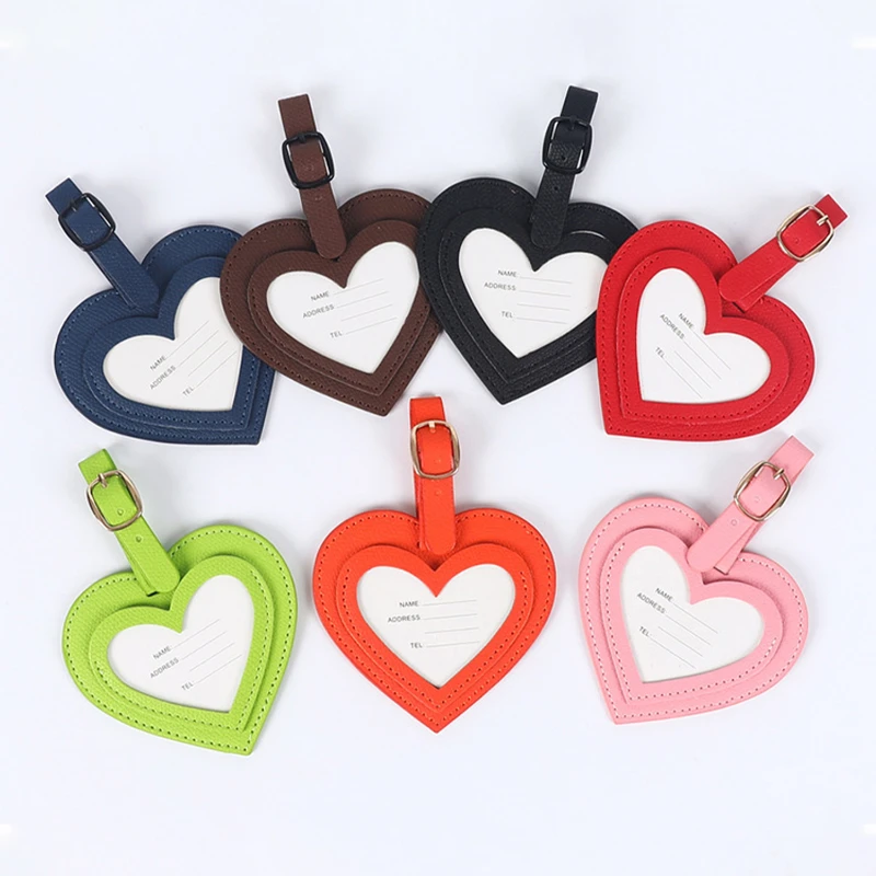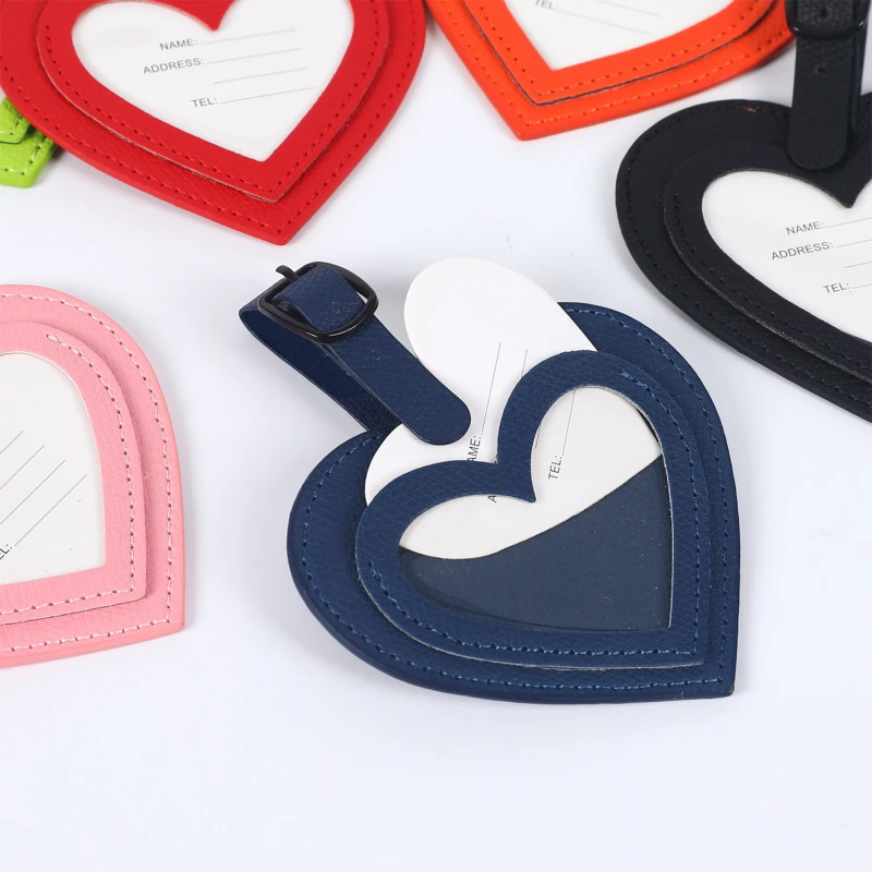 This luggage tag features a heart shaped design that adds a playful and stylish touch to travel gear. Made from durable Vegan Leather with a textured finish, it offers both visual appeal and everyday durability. The open heart window allows quick identification while holding a printed ID card securely inside. Finished with clean stitching and an adjustable strap with metal buckle for easy attachment to suitcases, carry ons, and backpacks. Overall size is approximately 3.54 x 3.22 inches. Ideal for travel accessories, promotional giveaways, events, and custom logo branding.