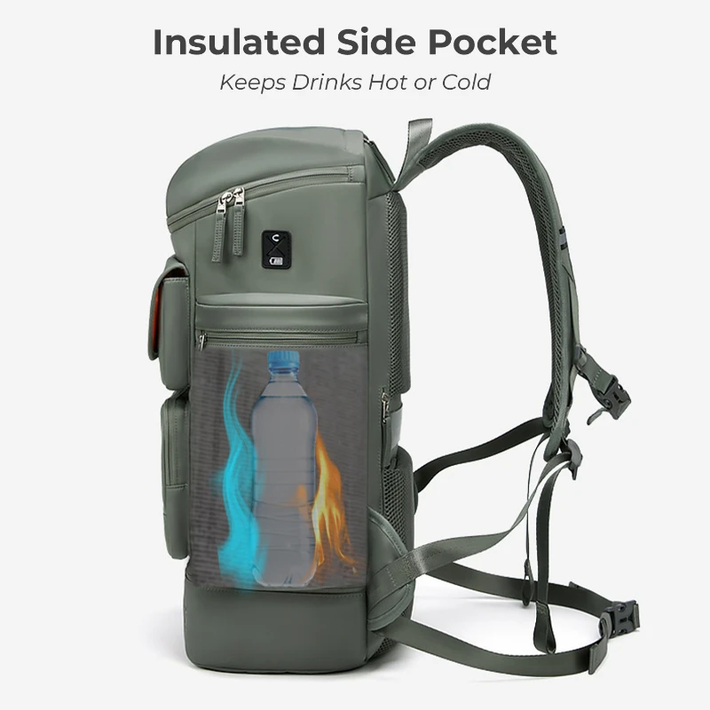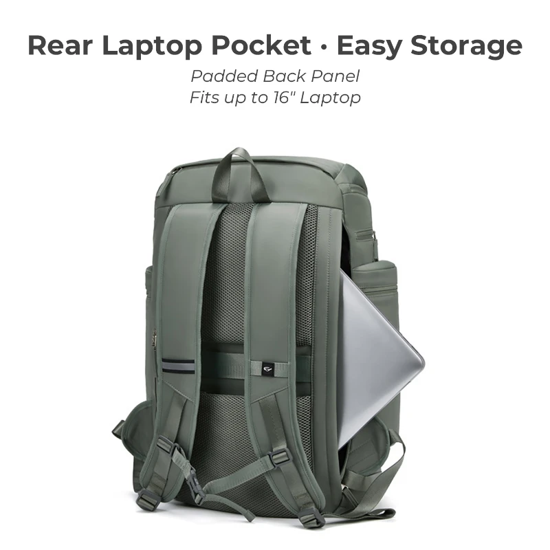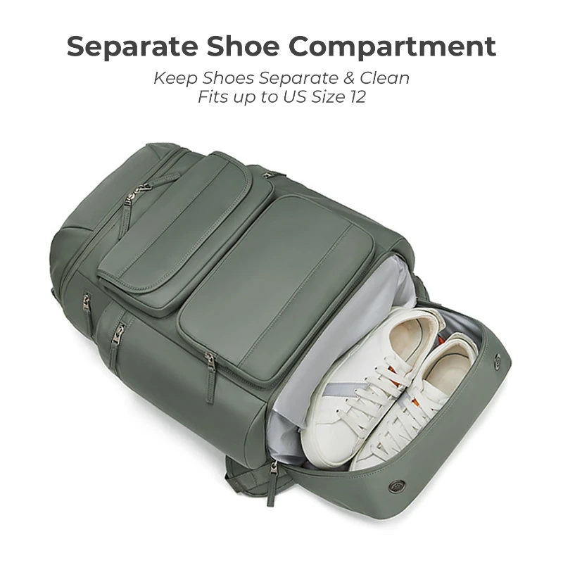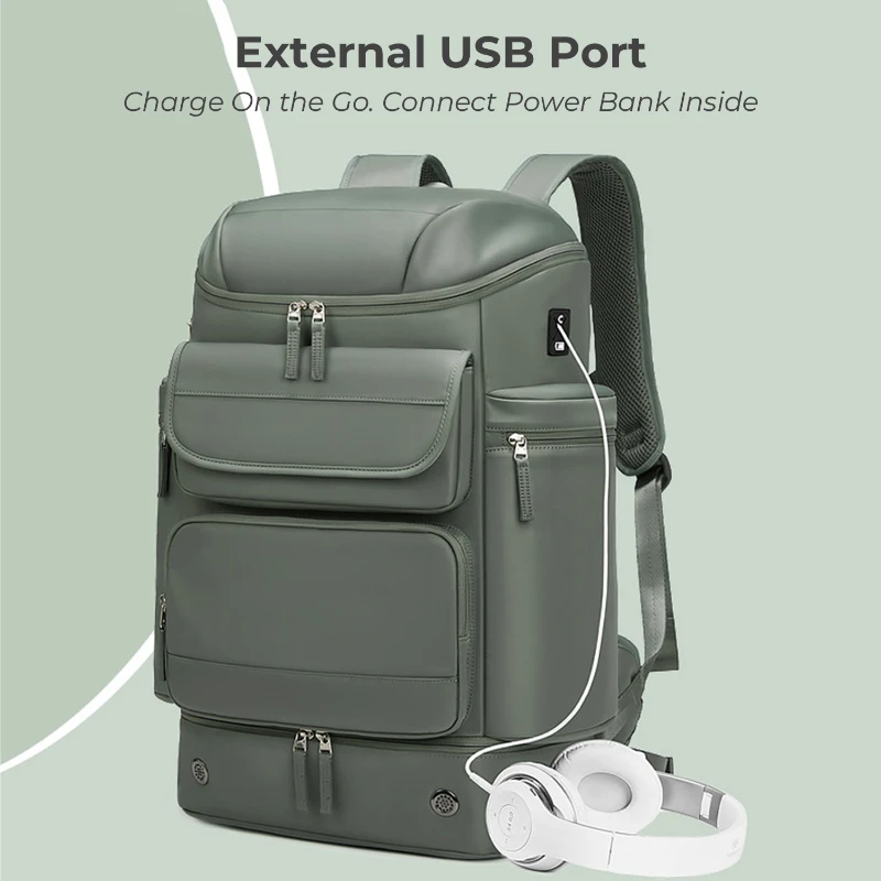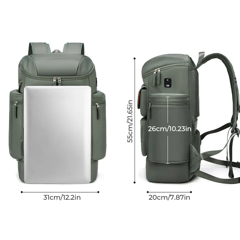This extra large capacity backpack is made of durable Oxford fabric with a structured design for travel, outdoor, and daily use. Features multiple storage compartments including a separate shoe pocket, padded laptop sleeve that fits up to 16 in. laptop, insulated side pocket, front organizer pocket, and rear security pocket. Includes breathable padded back panel, adjustable shoulder straps, luggage strap, and external USB port for charging on the go. Size is 21.65 in. H x 12.20 in. W x 7.87 in. D. Ideal for travel, hiking, commuting, and business use.