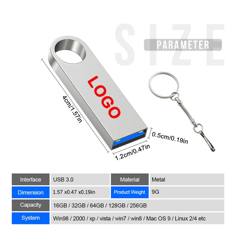 The High-Speed USB 3.0 Metal Flash Drive offers a sleek and durable solution for all your data storage needs. Available in capacities of 16GB, 32GB, 64GB, and 128GB, this high-speed flash drive supports various file formats including documents, images, videos, and music. Constructed with a robust metal casing, it is waterproof, shockproof, antimagnetic, and X-ray proof, ensuring your data is well-protected. With read speeds up to 18MB/s and write speeds up to 10MB/s, this flash drive guarantees efficient data transfer. Its compact size (1.57 x 0.47 x 0.16 inches) and lightweight design (0.02 pounds) make it easy to carry. Compatible with both PC and Mac, and comes with a convenient key ring for portability.