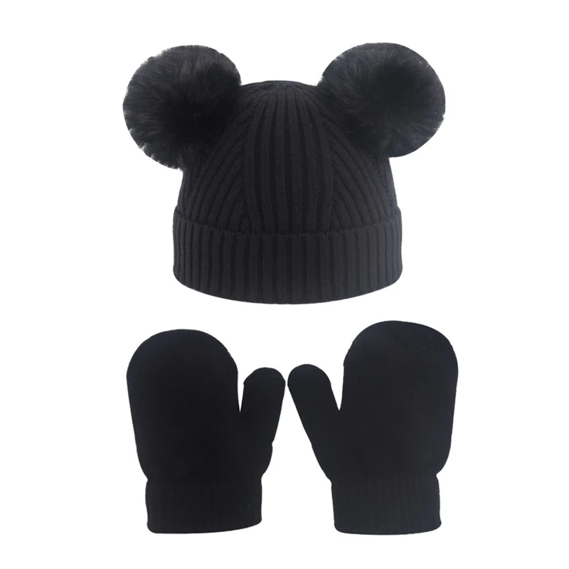 Keep your little ones warm and stylish with this adorable winter hat and mittens set. The knit hat features two playful faux fur pom-poms for a charming touch, while the matching mittens provide extra warmth for chilly days. Made from soft and cozy materials, the set is perfect for outdoor play, school, or casual outings during the winter season. The stretchy ribbed design ensures a snug and comfortable fit. Available in various colors, this set is an ideal gift for boys and girls to stay cozy and fashionable.