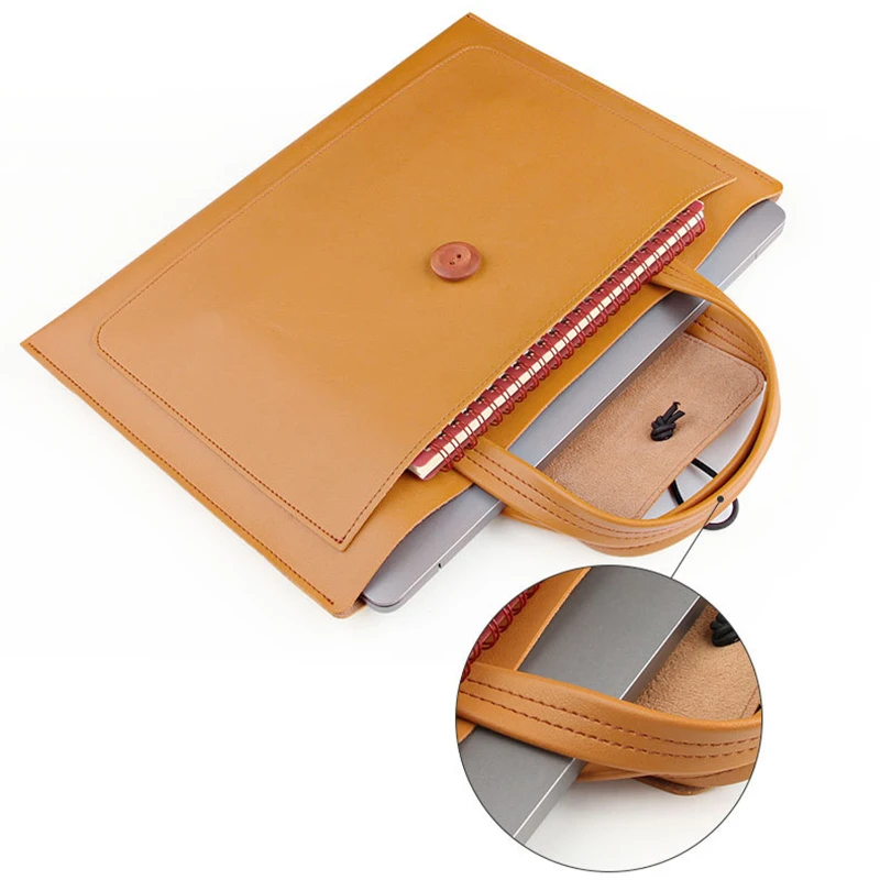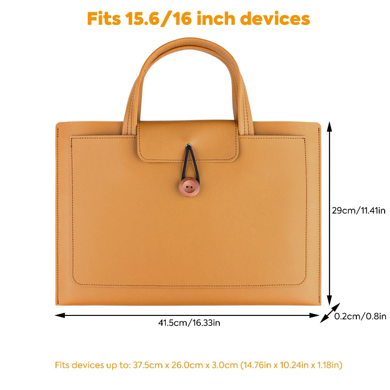 This elegant laptop sleeve is crafted from high-quality faux leather, designed to protect and carry laptops up to 15.6/16 inches. The durable exterior and soft, protective interior prevent scratches and damage to your device. It features a stylish handle and a secure button closure, combining fashion with functionality. With its spacious design, it can also accommodate tablets, notebooks, and chargers. Available in multiple colors, this laptop sleeve is ideal for professionals looking for a sleek and practical solution to protect their devices while on the move.