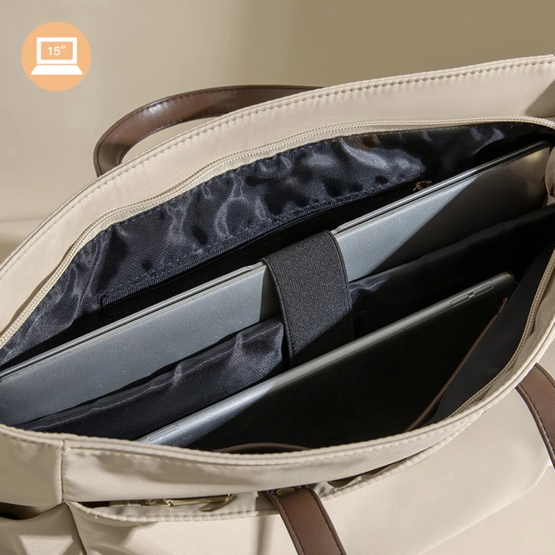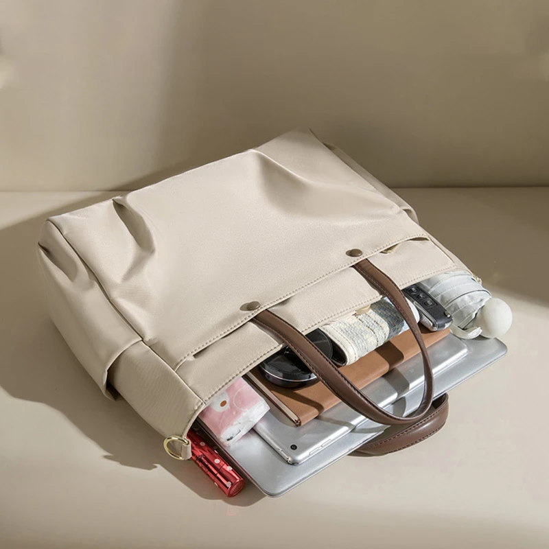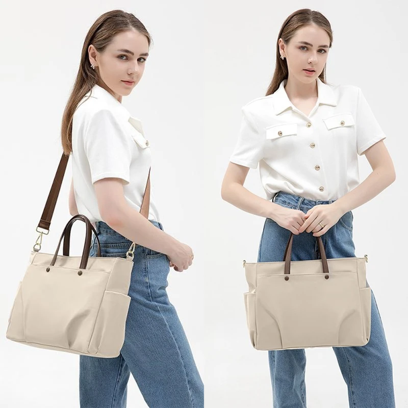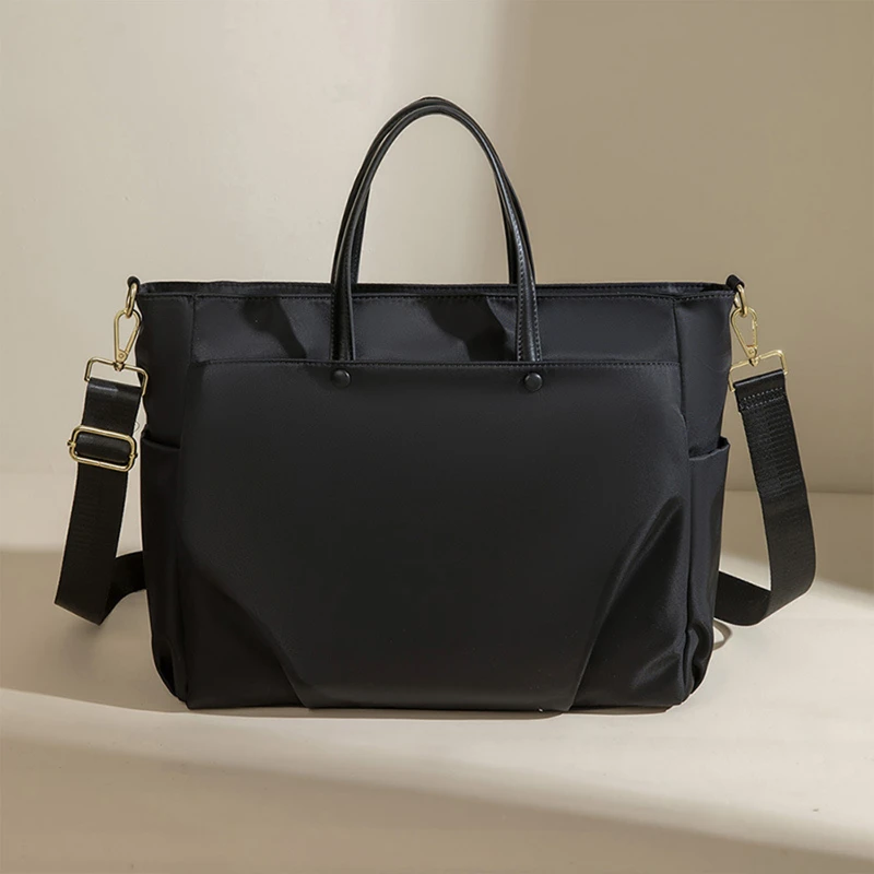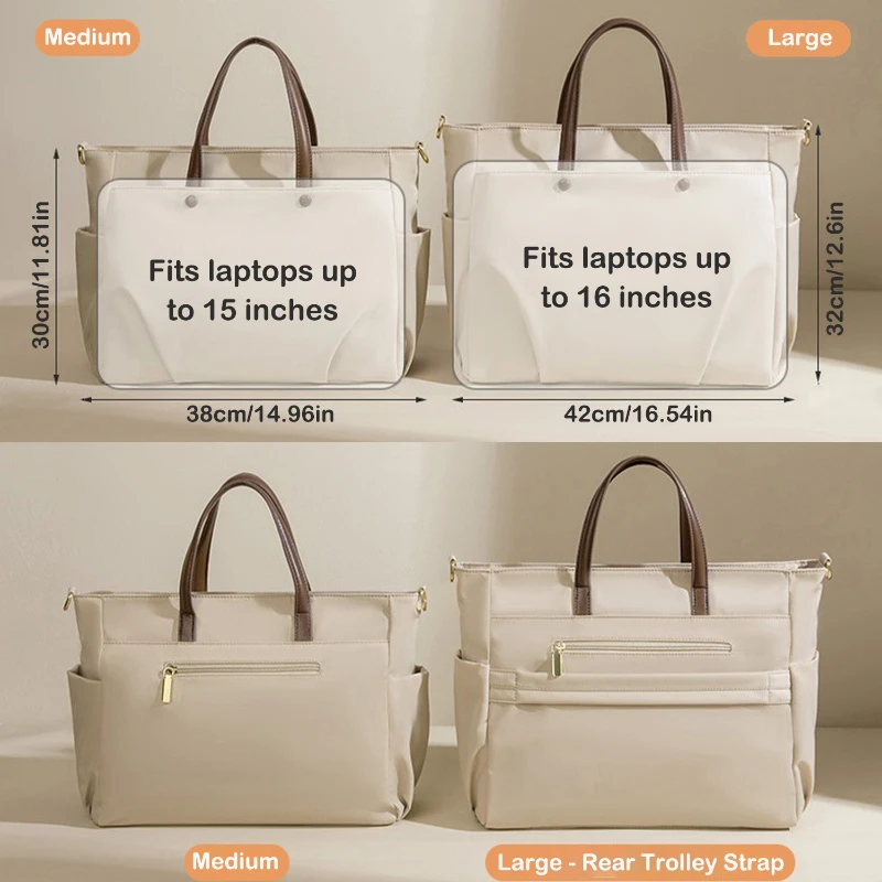 The Laptop Tote Bag for Women is crafted from high-quality nylon oxford cloth, ensuring durability and a sleek appearance. Available in two sizes: medium, weighing approximately 1.15 pounds, and large, weighing approximately 1.28 pounds. The medium size accommodates laptops up to 15 inches, while the large size fits laptops up to 16 inches. This tote features a spacious main compartment, multiple interior and exterior pockets for organized storage, comfortable dual handles, and a detachable shoulder strap for versatile carrying options. Ideal for professional settings, travel, and everyday use, the bag combines functionality with elegant design.
