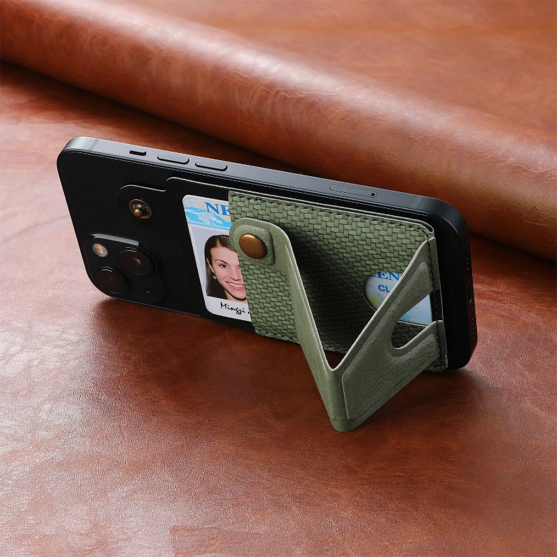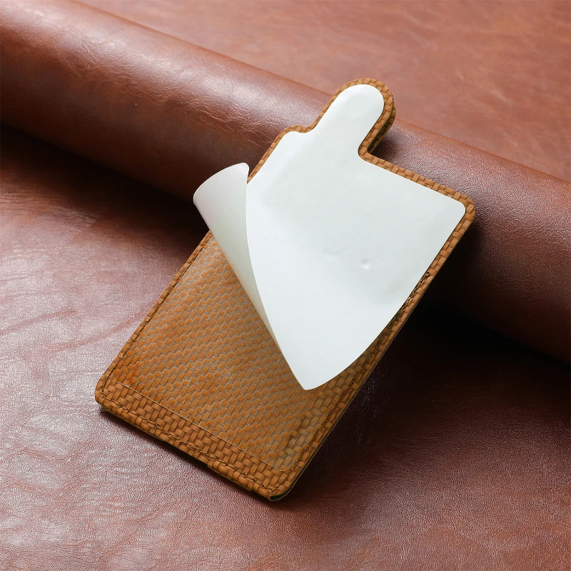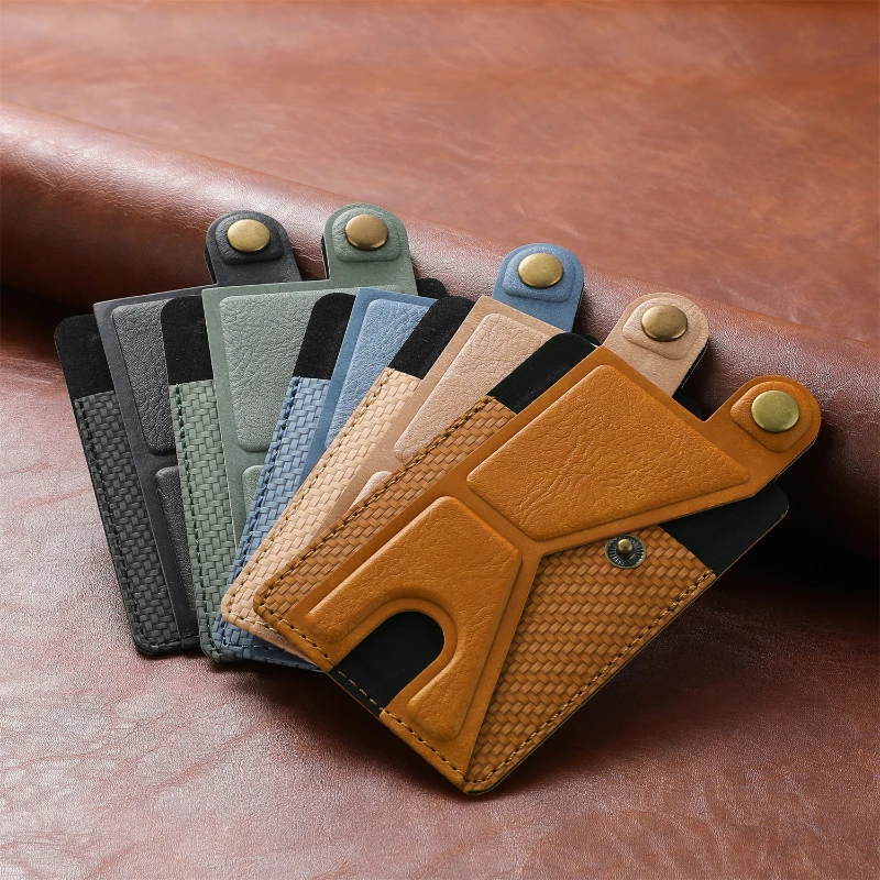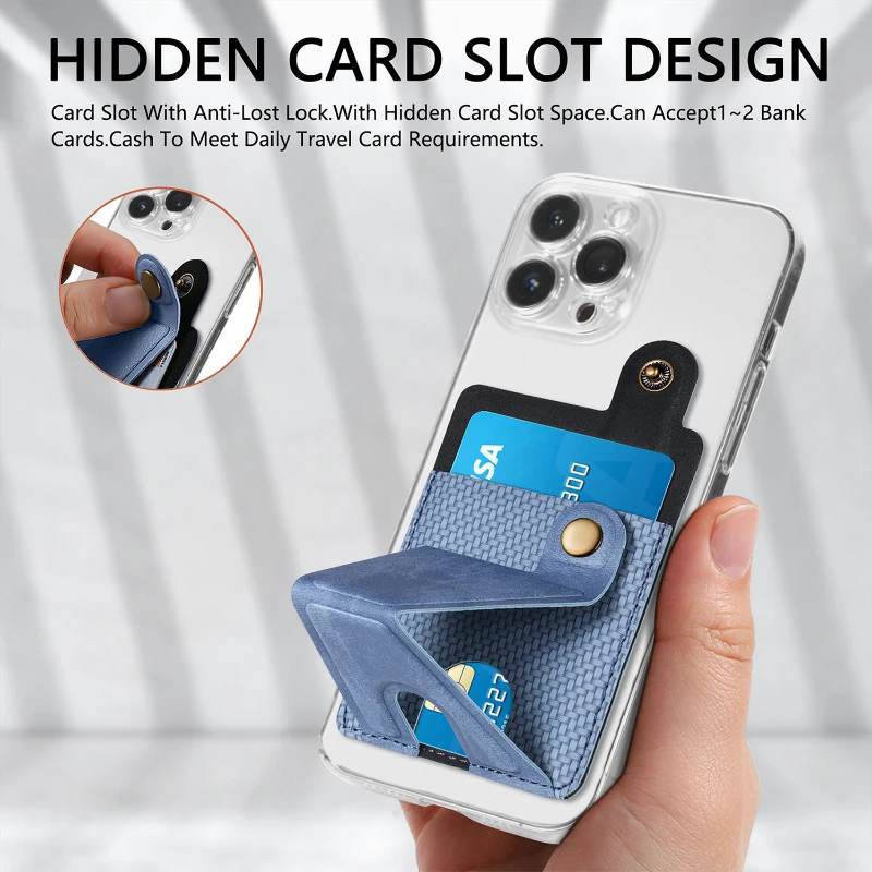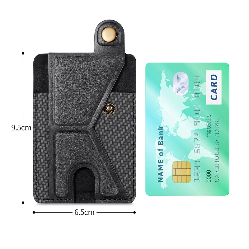 Discover the versatile PU leather smartphone back cardholder, measuring 3.74″ x 2.56″ x 0.39″. Equipped with a 3M adhesive backing for easy attachment to your phone, it features a wide card slot capable of holding multiple cards or loose change. The foldable design acts as a convenient phone stand with a secure clasp.