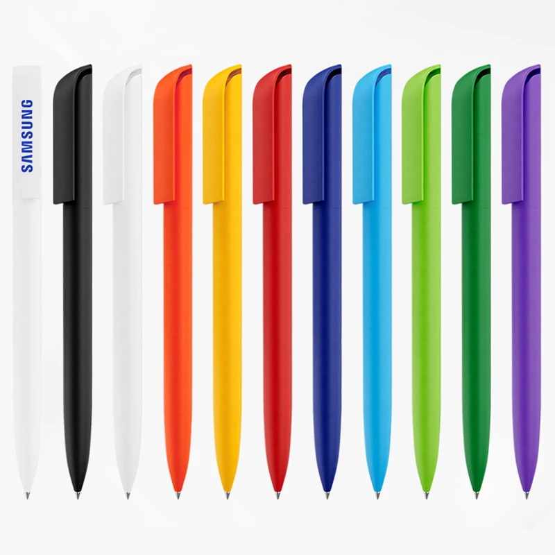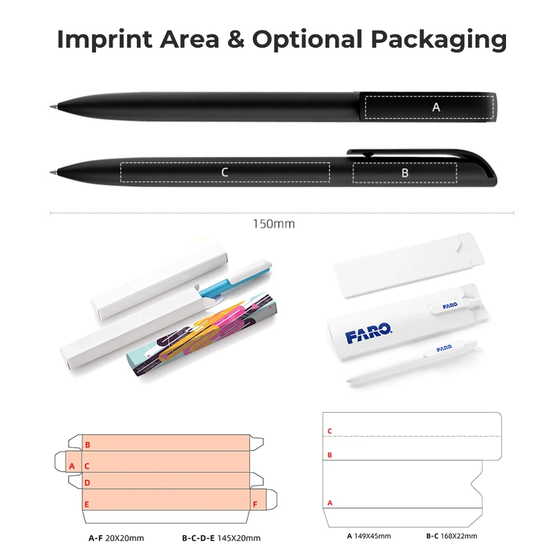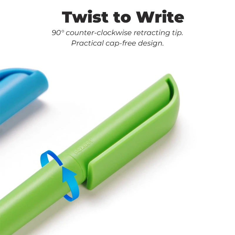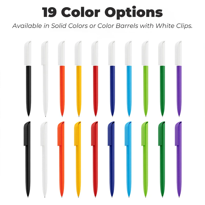 Minimalist twist-action gel pen designed with a smooth matte barrel and cap-free structure for effortless everyday writing. A simple 90 degree twist extends or retracts the tip, preventing lost caps and improving convenience. Features a reliable 0.5mm black gel ink refill that delivers smooth, quick-drying lines for notes, signatures, and daily use. The slim round barrel offers a comfortable grip and a clean modern look. Made from durable plastic and available in 19 color options, including solid colors and color barrels with white clips. Multiple imprint areas support logo and brand customization. Optional packaging available.