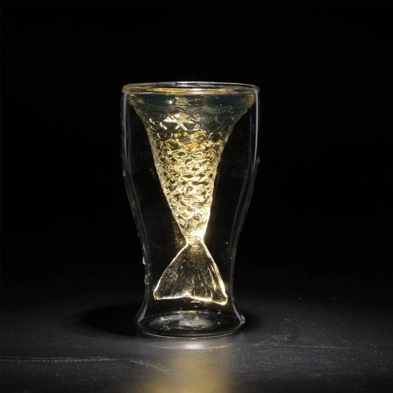Mermaid Glasses, made of glass, with a capacity of 3.4 oz and dimensions of 2.76 in (top diameter), 2.36 in (bottom diameter), and 5.31 in (height). These glasses can withstand temperatures from -4 to 356 degrees Fahrenheit. Their unique mermaid-inspired design makes them the perfect drinking companions.