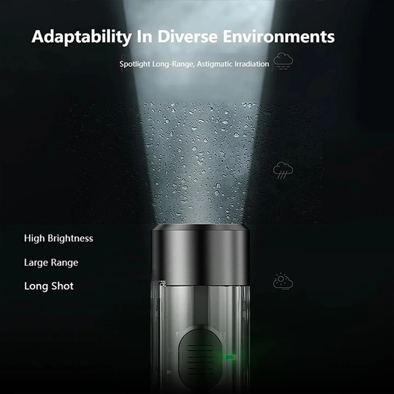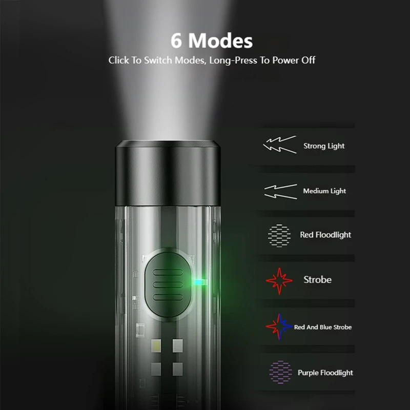 The Mini Keychain Rechargeable Flashlight is a compact and versatile lighting solution, perfect for everyday carry and emergency use. Featuring a combination of LED and SMD lamp cores, this flashlight offers six lighting modes: strong light, medium light, flood light, red light strobe, red and blue strobe, and purple flood light. Made from durable ABS and PC materials, it is life waterproof, ensuring reliable performance in various conditions. It includes a built-in 200mAh lithium battery, rechargeable via a Type-C interface, and provides 1.5 to 3.5 hours of working time. Weighing only 0.8 ounces and measuring 3.2 x 0.7 inches, this flashlight is lightweight and easily portable.