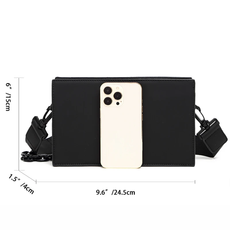 This sleek and stylish minimalist chain box shoulder bag is a versatile accessory for men and women. Measuring 9.6″ x 6″ x 1.5″, it provides ample space for your phone, wallet, and small essentials. The bag features a durable chain strap for a trendy look and a detachable shoulder strap for convenience. With its structured rectangular design, secure zip closure, and additional compartments, this bag is perfect for casual outings, parties, or travel. Its lightweight build and chic design make it an essential for fashion-forward individuals.