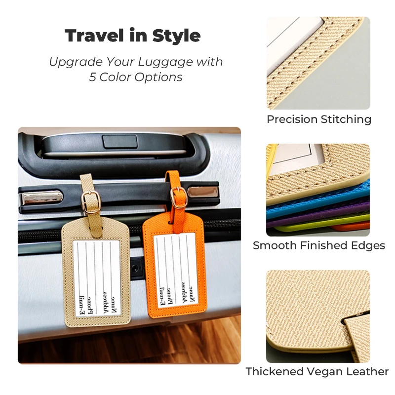 This minimalist luggage tag is crafted from thick double layer Vegan Leather for enhanced durability and a premium hand feel. The clean rectangular design keeps personal information easy to identify while maintaining a professional appearance. Finished with precision stitching, smooth sealed edges, and an adjustable strap with metal buckle, it attaches securely to suitcases, carry ons, and travel bags. An information card is included for quick identification. Overall size is approximately 4.52 x 2.75 inches. Ideal for travel identification, corporate gifts, promotional programs, and custom logo branding.