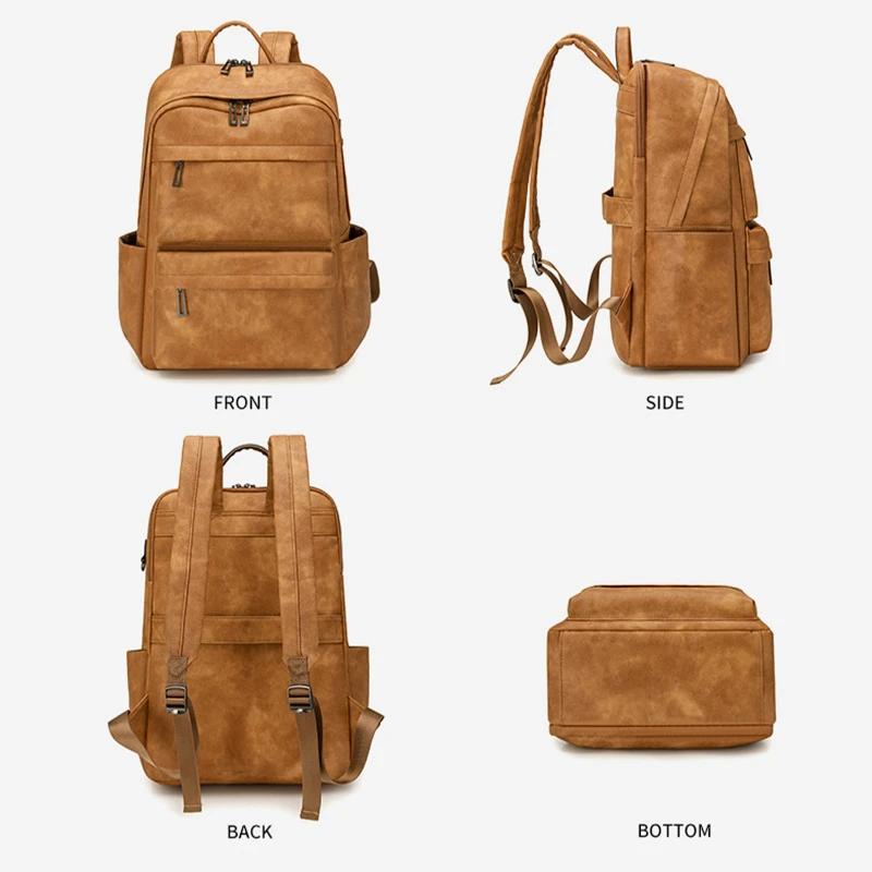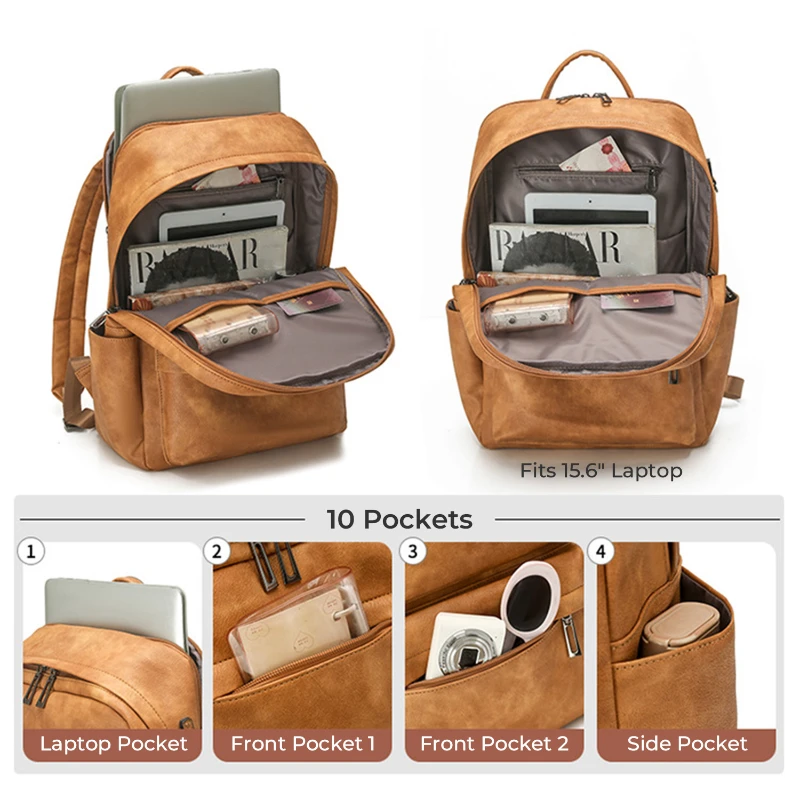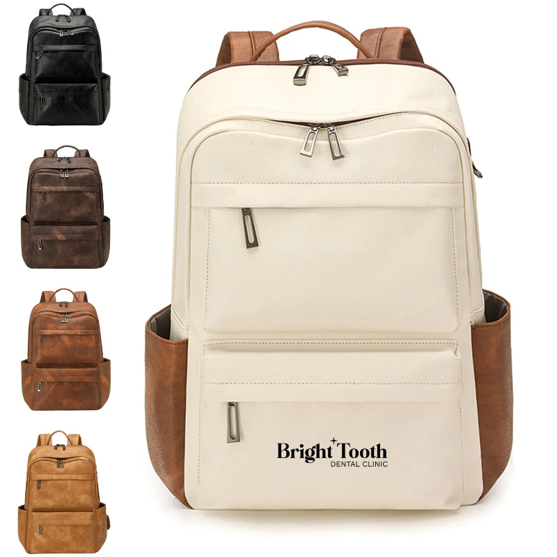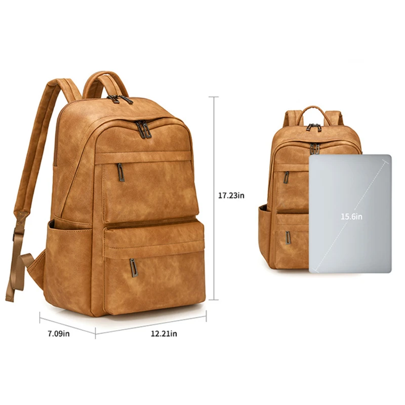 This water resistant backpack features a clean business casual look with textured vegan leather and a classic grain finish for a professional appearance. Sized at 17.23 x 12.21 x 7.09 in, it fits up to a 15.6 in laptop in a dedicated compartment. Multiple zippered front pockets and 2 side pockets help organize daily essentials, cosmetics, glasses, bottles, or an umbrella. The rear luggage strap supports easier airport travel. Ideal for commuting, meetings, gifting, and light travel.