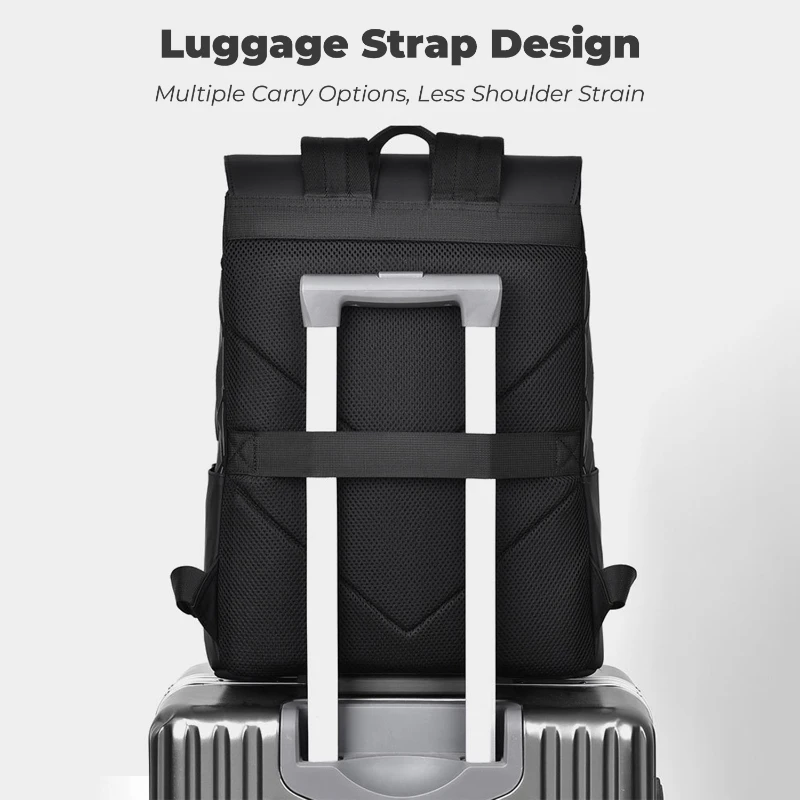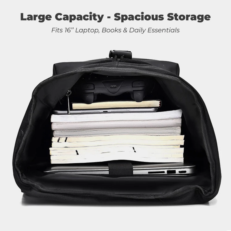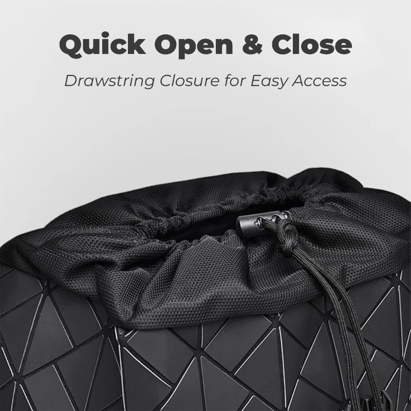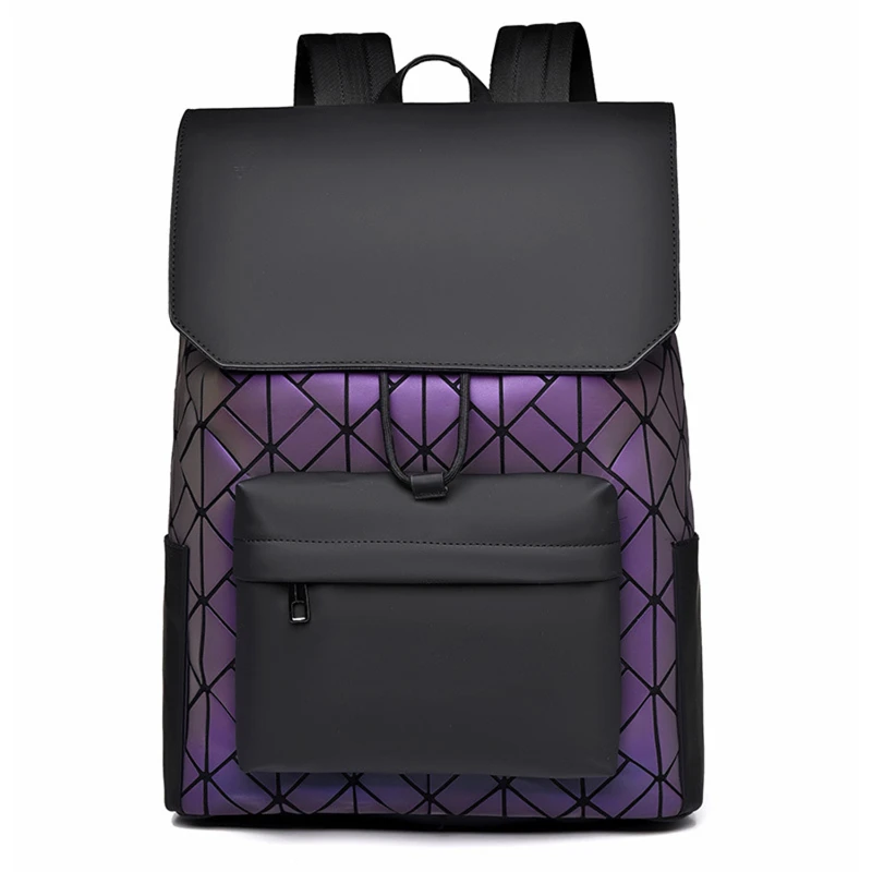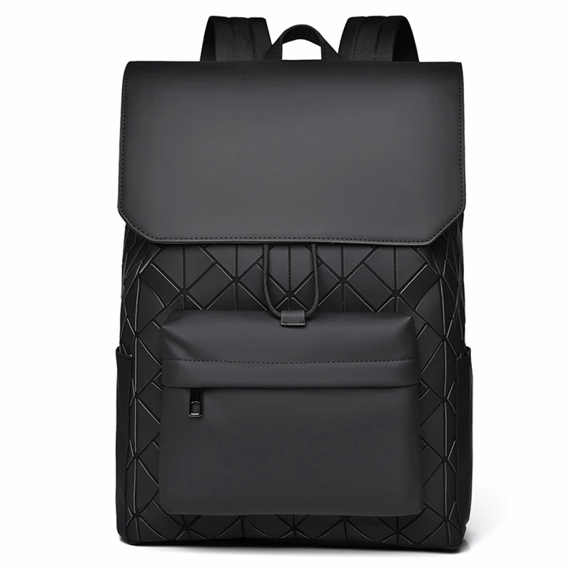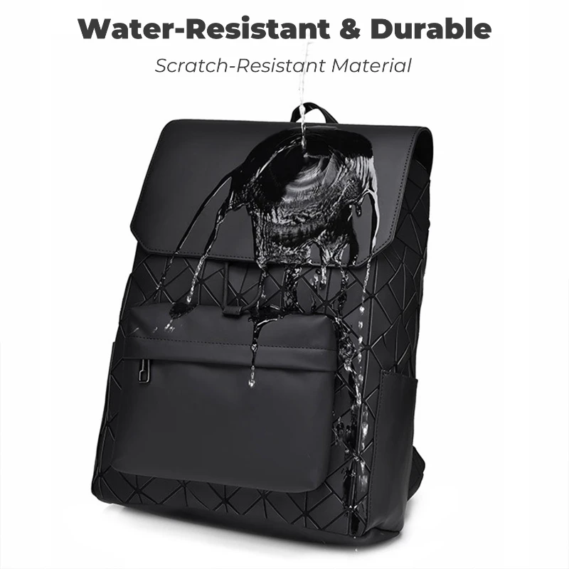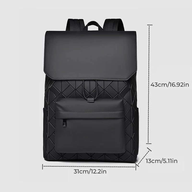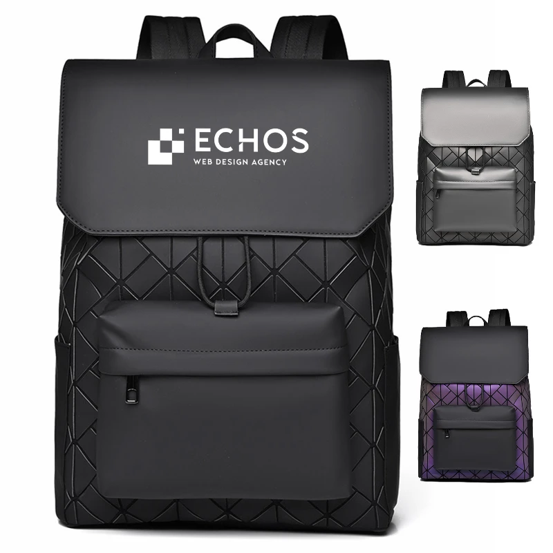 This large capacity backpack features a structured geometric exterior with a smooth matte flap for a clean professional appearance. Made of durable water resistant material with a drawstring top closure, front zip pocket, side pockets, breathable padded back panel, and built in luggage strap for travel. Fits up to a 16 in. laptop along with books and daily essentials. Size is 16.92 in. H x 12.20 in. W x 5.11 in. D. Ideal for office use, commuting, school, and corporate gifts. Available in black, gray, and iridescent.