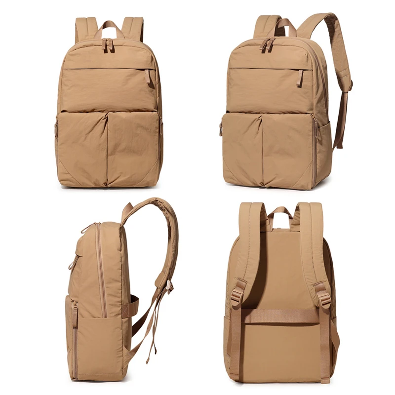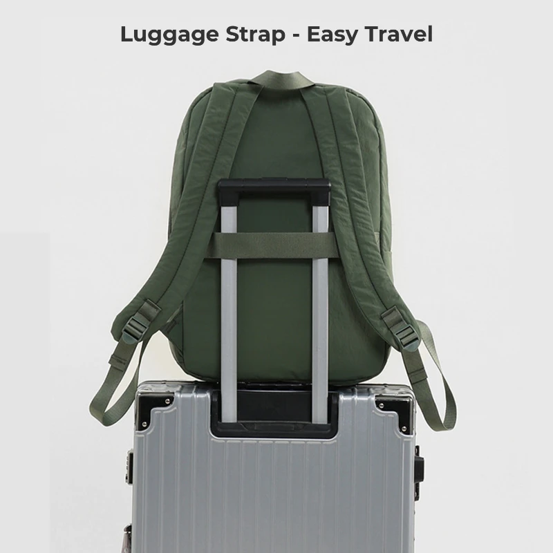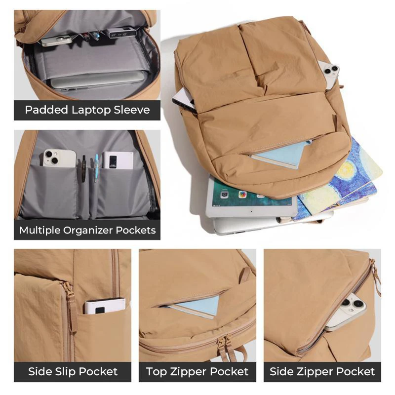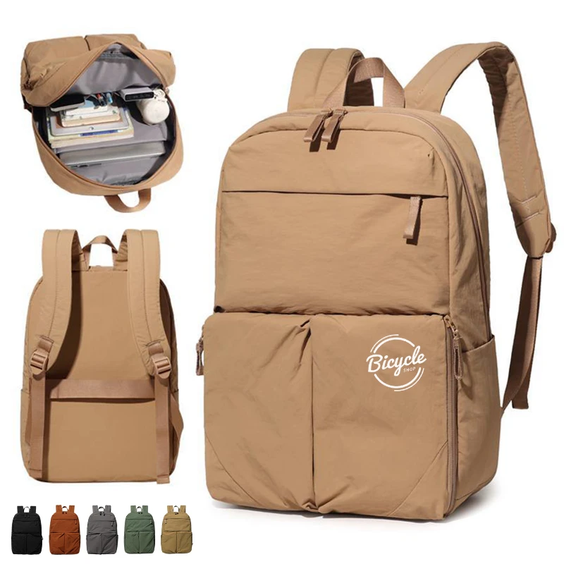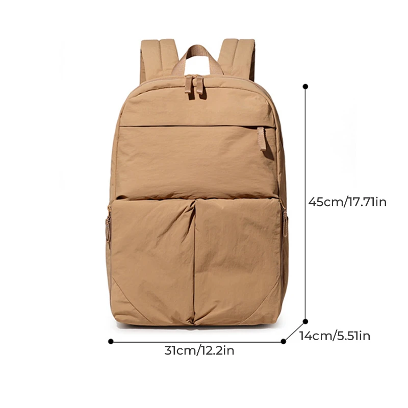 Designed for everyday organization, this lightweight nylon backpack offers practical storage for work, school, or daily commuting. The spacious main compartment includes a padded sleeve that fits laptops up to 15.6 in. Interior organizer pockets keep phones, pens, and accessories neatly arranged. Exterior front storage pockets, side pockets, and a top zipper pocket provide quick access to essentials. A rear luggage strap allows the bag to attach securely to rolling luggage for convenient airport mobility. Made from water resistant nylon with padded shoulder straps for comfortable all day carry. Size 17.72 x 12.20 x 5.51 in. Weight 1.06 lb.